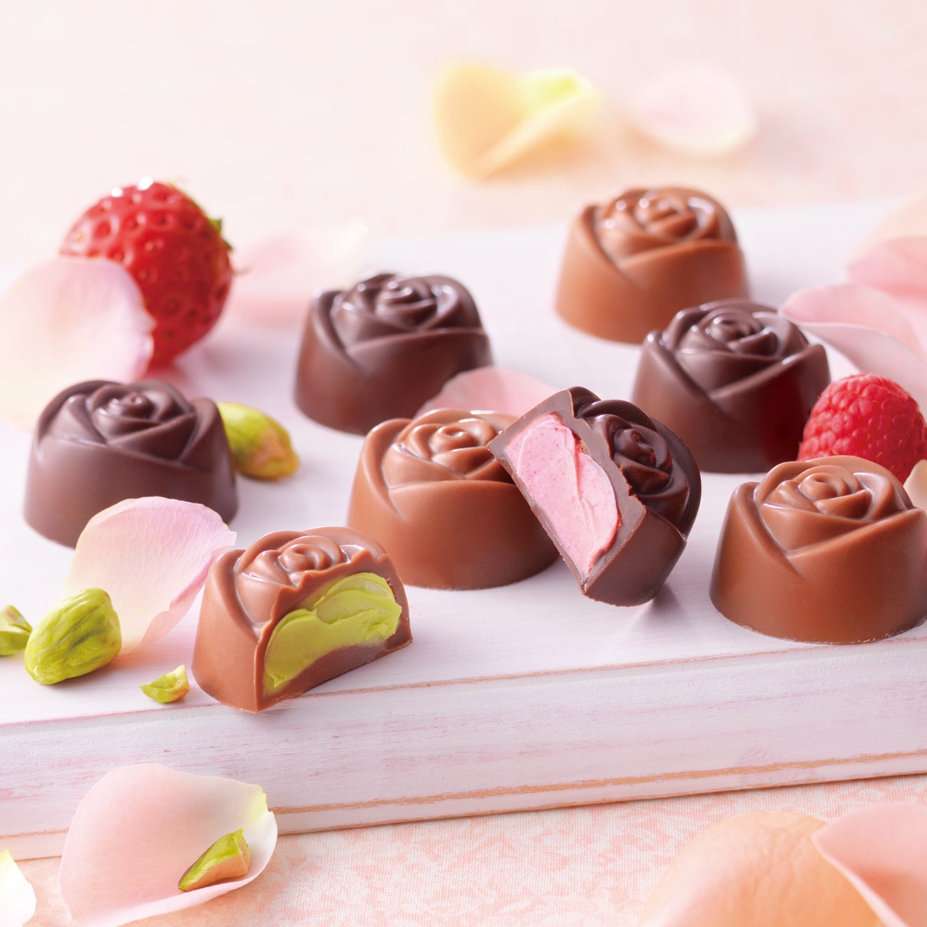 バラをかたどったひと口ショコラに、やさしいバラの香りが広がるクリームを閉じ込めました。ベリーの甘酸っぱさを感じる[ローズ&ベリー]と、ピスタチオの香ばしさが広がる[ローズ&ピスタチオ]の2種セットです。
