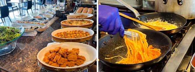茨城県産の食材を中心にサラダバーや、ドリンクバー、スープ、温菜、冷菜、デザート等の約30品目をブッフェ形式でお楽しみいただけます。また、ライブキッチンではローストビーフ&パスタを目の前でシェフが仕上げてご提供いたします。