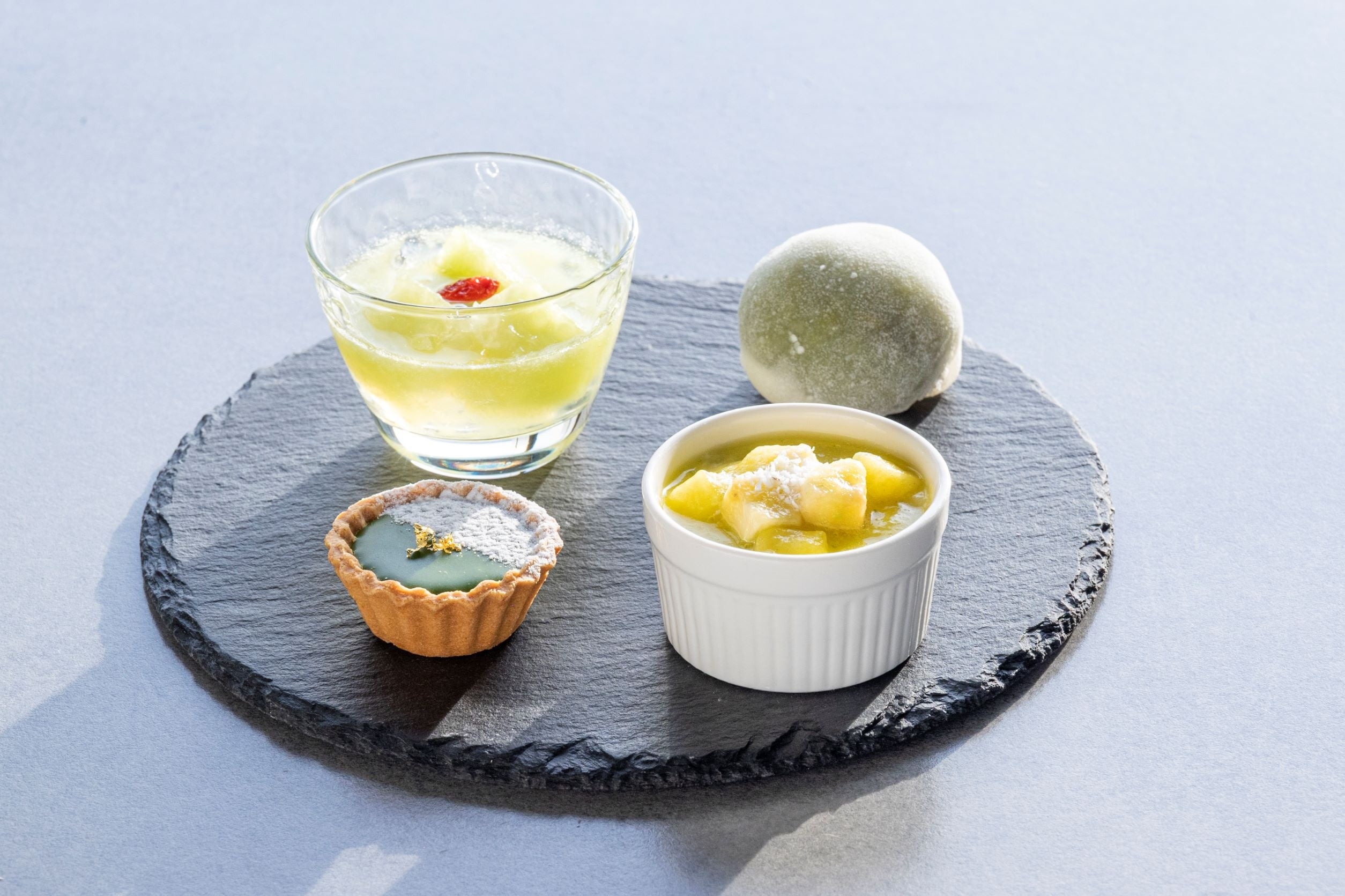 スイーツには、甘さ控えめで枝豆の風味を損なうことなく仕上げた「ずんだあんの求肥包み」や、牛乳よりも低カロリーで食物繊維が豊富な「オーツミルク」を使用しあっさりとした口当たりと麦由来のほのかな甘みをお楽しみいただける「オーツミルクのブランマンジェ」などをご用意します。セイボリーには旬のカジキを燻製にした「燻製カジキのグリーンサンド」や、玉ねぎの甘さも楽しめ見た目にも爽やかな「そら豆のスープ」などをご用意します。