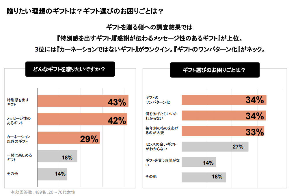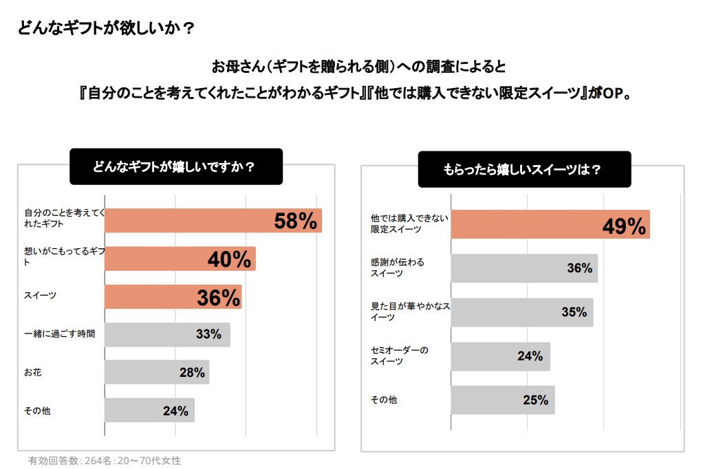 Cake.jpでは「母の日に関する意識調査」を実施したところ、お母さん(贈られる方)の回答では「自分のことを考えてくれたギフト」「他では購入できない限定スイーツ」が嬉しいという結果に。一方、子ども(贈る側)は「特別感を出すギフト」「感謝が伝わるメッセージ性のあるギフト」が人気でした。さらに3人に1人が「カーネーションではないギフト」を求めていることがわかり、「ギフトのワンパターン化」に困っているという声も多く寄せられました。