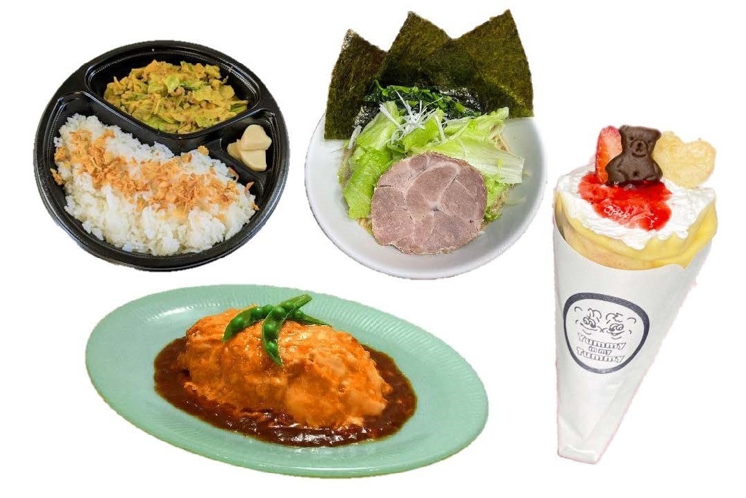 ([上段左]タケノコと春キャベツのキーマカレー、[上段中央]横浜家系サラダラーメン、[下]こだわりオムライス、[右]いちごチョコミルフィーユなど)