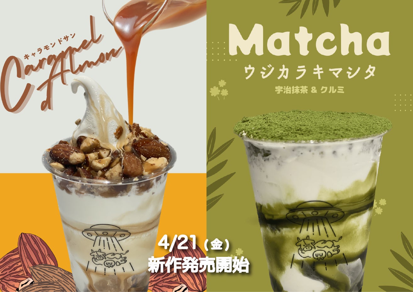 先月のオープン以来、真夜中に多くの方が濃厚なアイスを求めてお越しいただいている夜アイス専門店「真夜中牧場」がが、4月21日(金)に新メニューを発表します。新たに登場するのは、「ウジカラキマシタ」と「キャラモンドサン」の2つのフレーバーです。