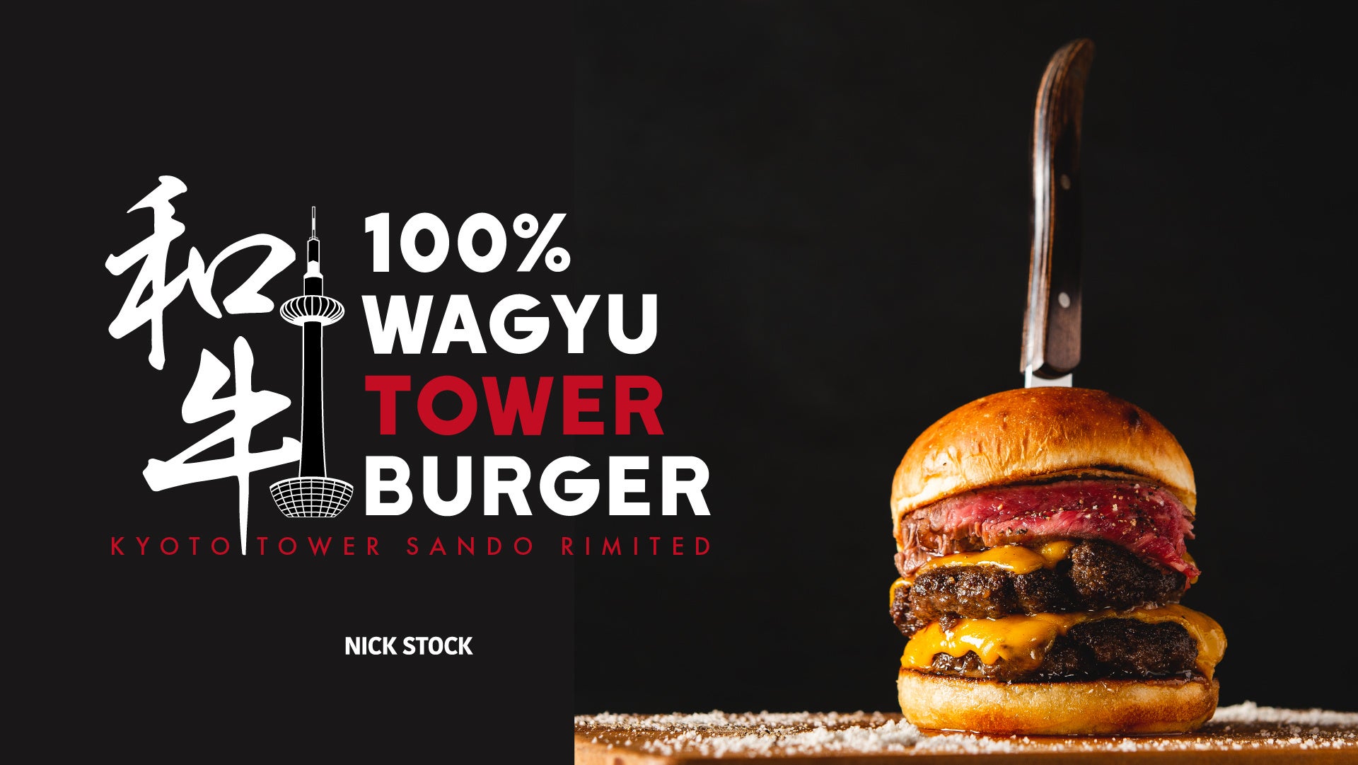 和牛パティと和牛ステーキを京都タワーのように高く積み上げたスペシャルな限定メニュー「100% WAGYU TOWER BURGER(100%和牛TOWERバーガー)」が新登場!