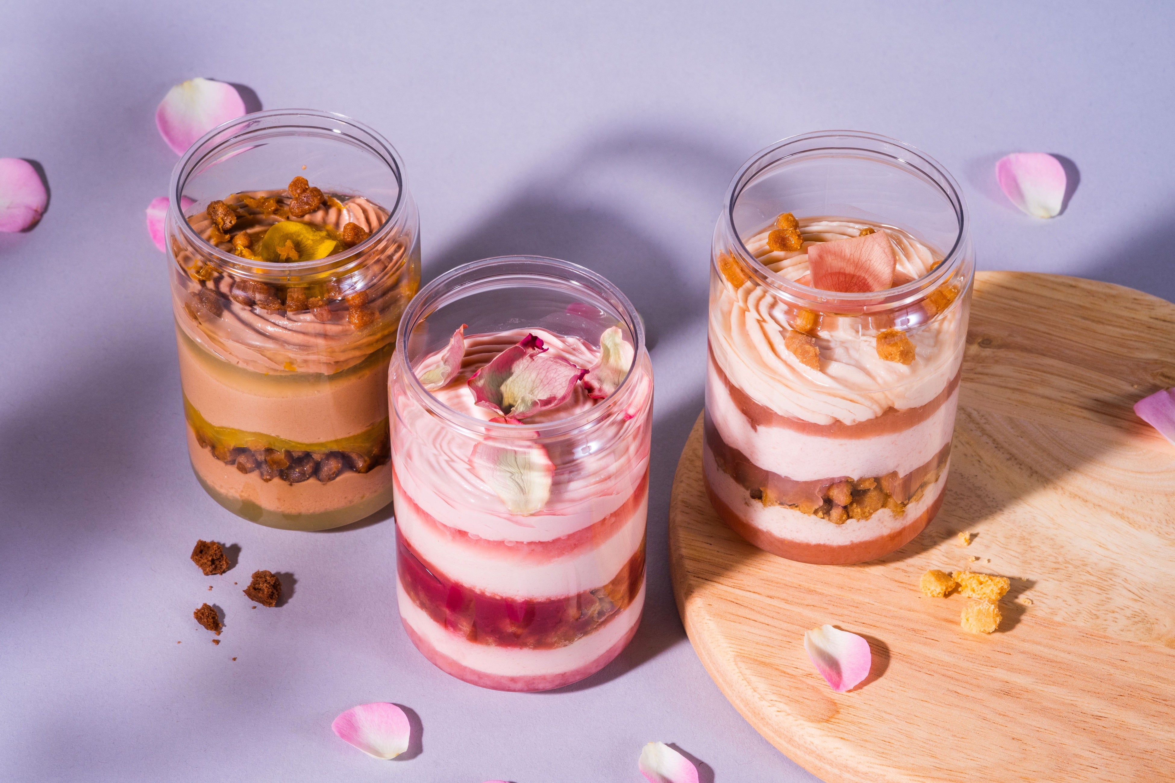 食感を楽しんでいただけるよう、クランブルにはホワイトチョコレートを一粒一粒コーティングして、サクサクの食感に。ムースやクリームは滑らかになるようにお作りしています。ジュレは解凍してもつるんとした食感を楽しめるよう、スフレチーズケーキはフワッとしっとり焼き上げて、詰め込んでいます。香りが1番のポイントで、瓶を空けて口に含んだ時に、薔薇や苺の芳醇な香り、ピスタチオの香ばしさやチーズのこくのある香り。新鮮な香りを逃さないようにお作りしました。