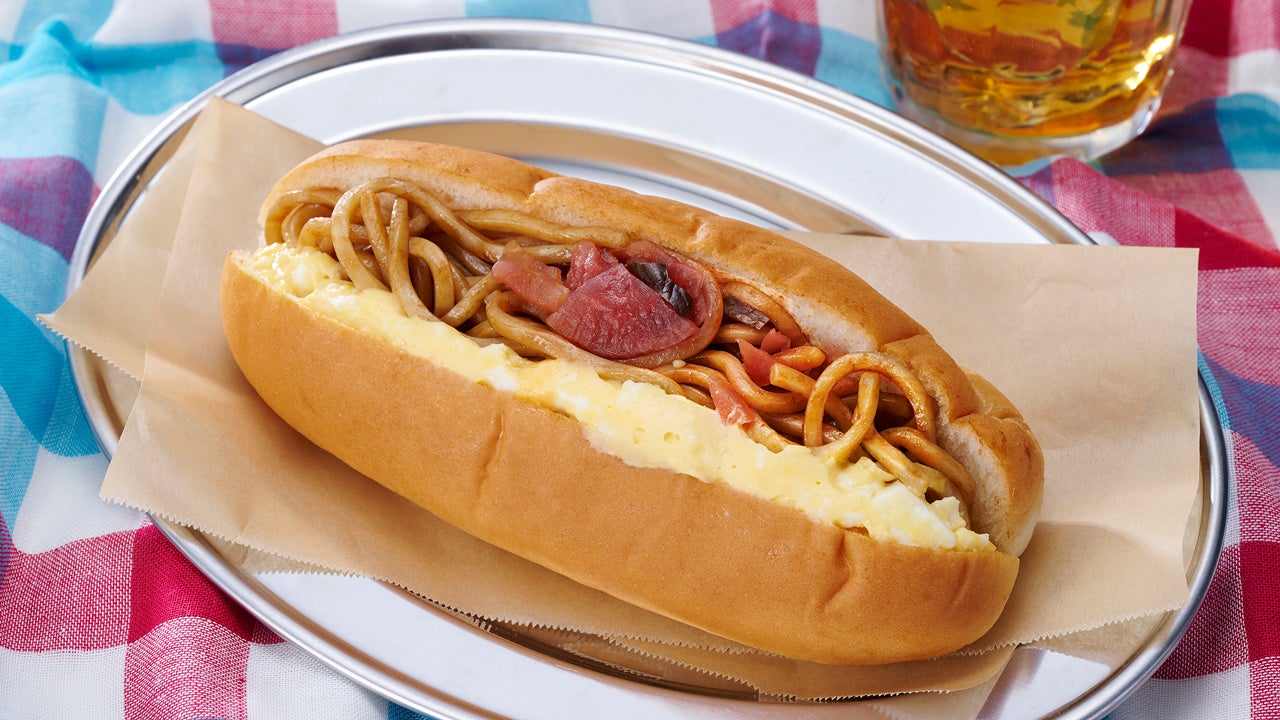 秋田県のB級グルメ「横手やきそば」をイメージした焼きそばをロールパンにサンドしました。太目の麺にソースがよく合います。また、「横手やきそば」の特徴であるたまごと福神漬けをトッピングしました。