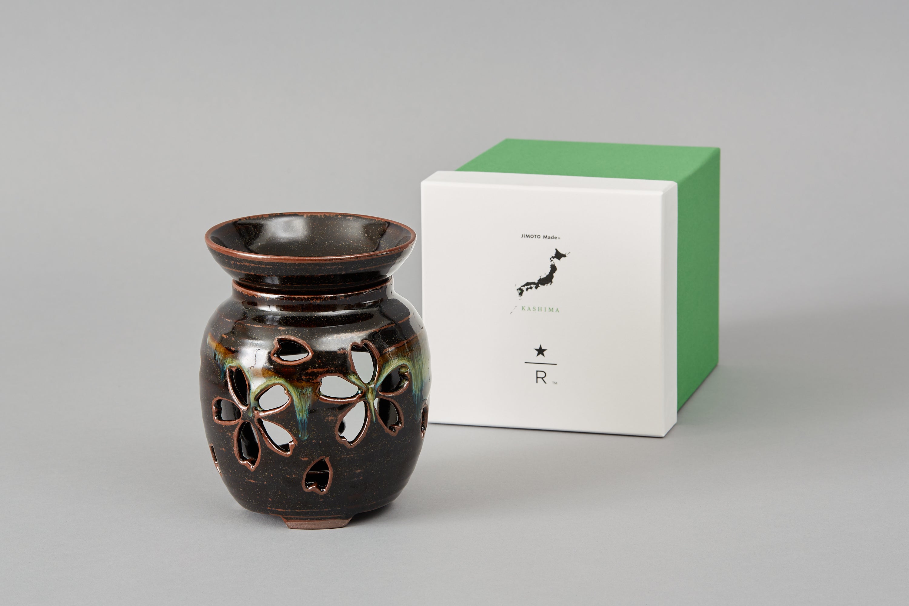 ロースタリー 東京で初めて登場する香炉『JIMOTO Made+ 嘉島窯香たけみや炉』は、手作業で大胆に桜の透かし彫りを施しました。受け皿に茶葉を乗せキャンドルホルダーに乗せたキャンドルに火を灯し、しばらくすると香ばしいお茶の香りに包まれることができます。あたりを暗くすると、彫刻から漏れる桜の灯りが幻想的な空間を演出します。昔ならではの香りとともに、特別な時間をお過ごしください。