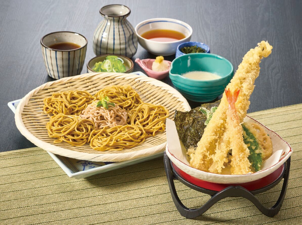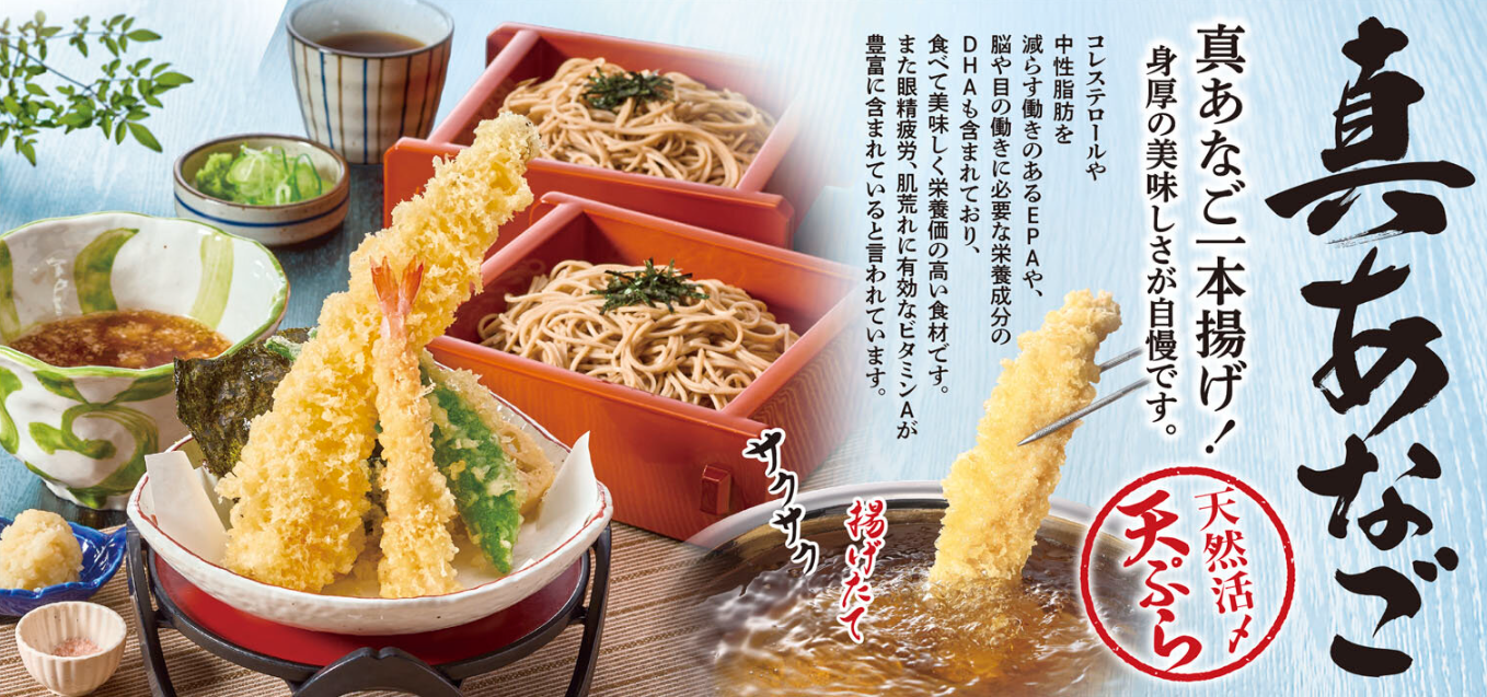 揚げたて、サクサクの天然活〆真あなごの天ぷらと、韃靼そば並びに毎日各店舗で製麺している国産そばが楽しめる自慢のメニューです。