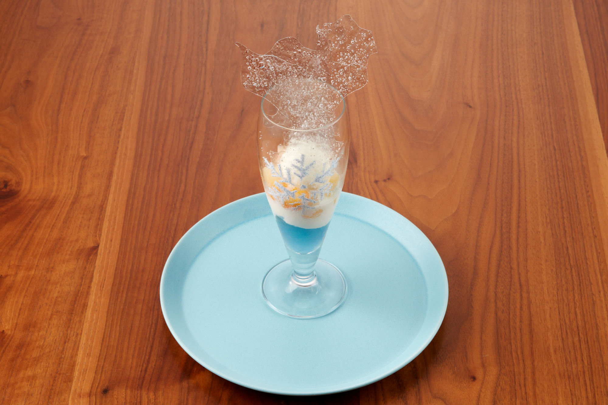 『アナと雪の女王』をモチーフに、雪山をイメージして、飴細工で躍動感を出し、グラスに粉糖で雪の結晶を表現。白と水色を基調にした世界観のあるパフェに仕上げました。