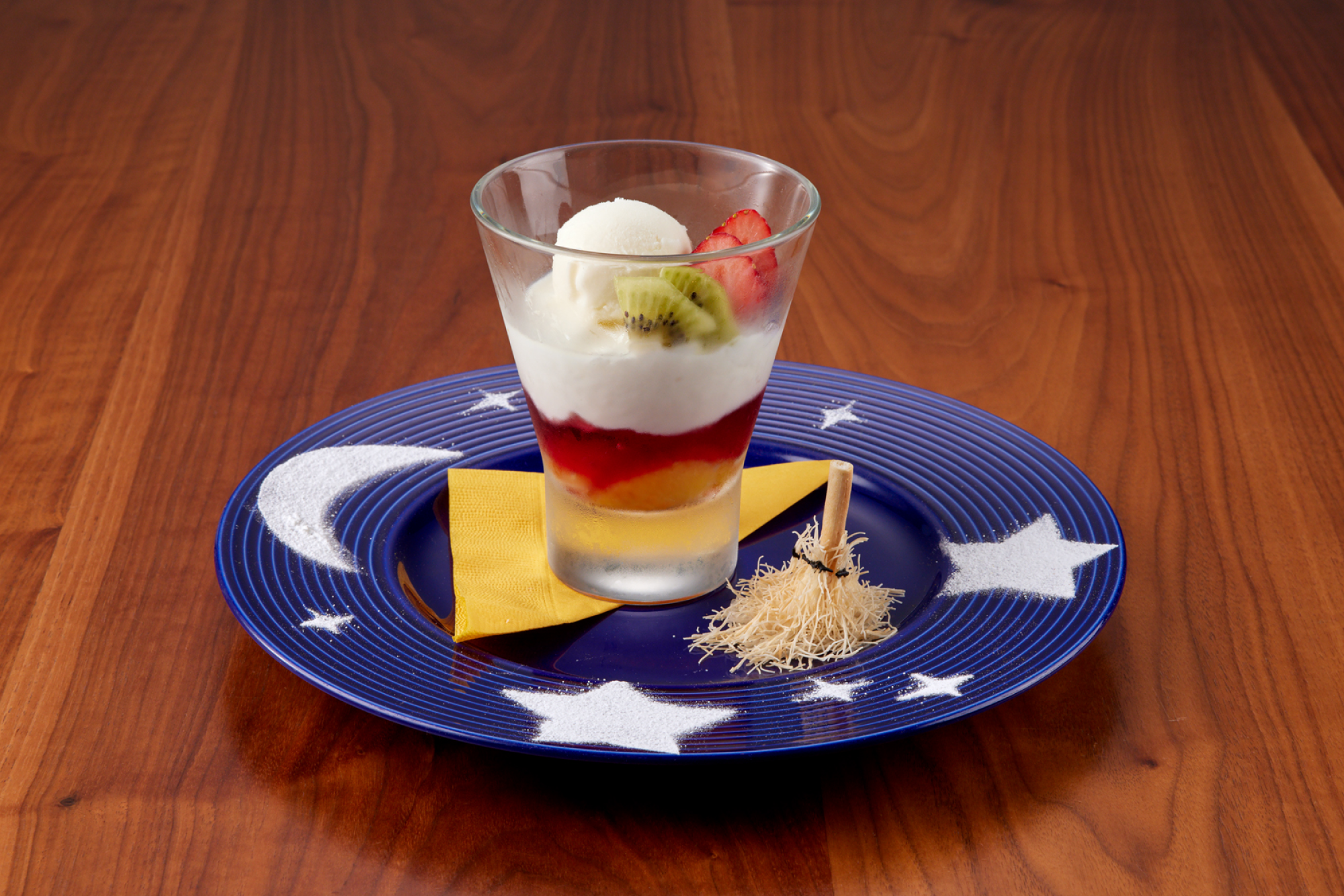 『ファンタジア』をイメージし、夜空の世界のお皿の上に、魔法使いの弟子であるミッキーマウスの衣装をパフェで表現しました。ヨーグルトとカダイフで作ったほうきがいまにも動き出しそう!