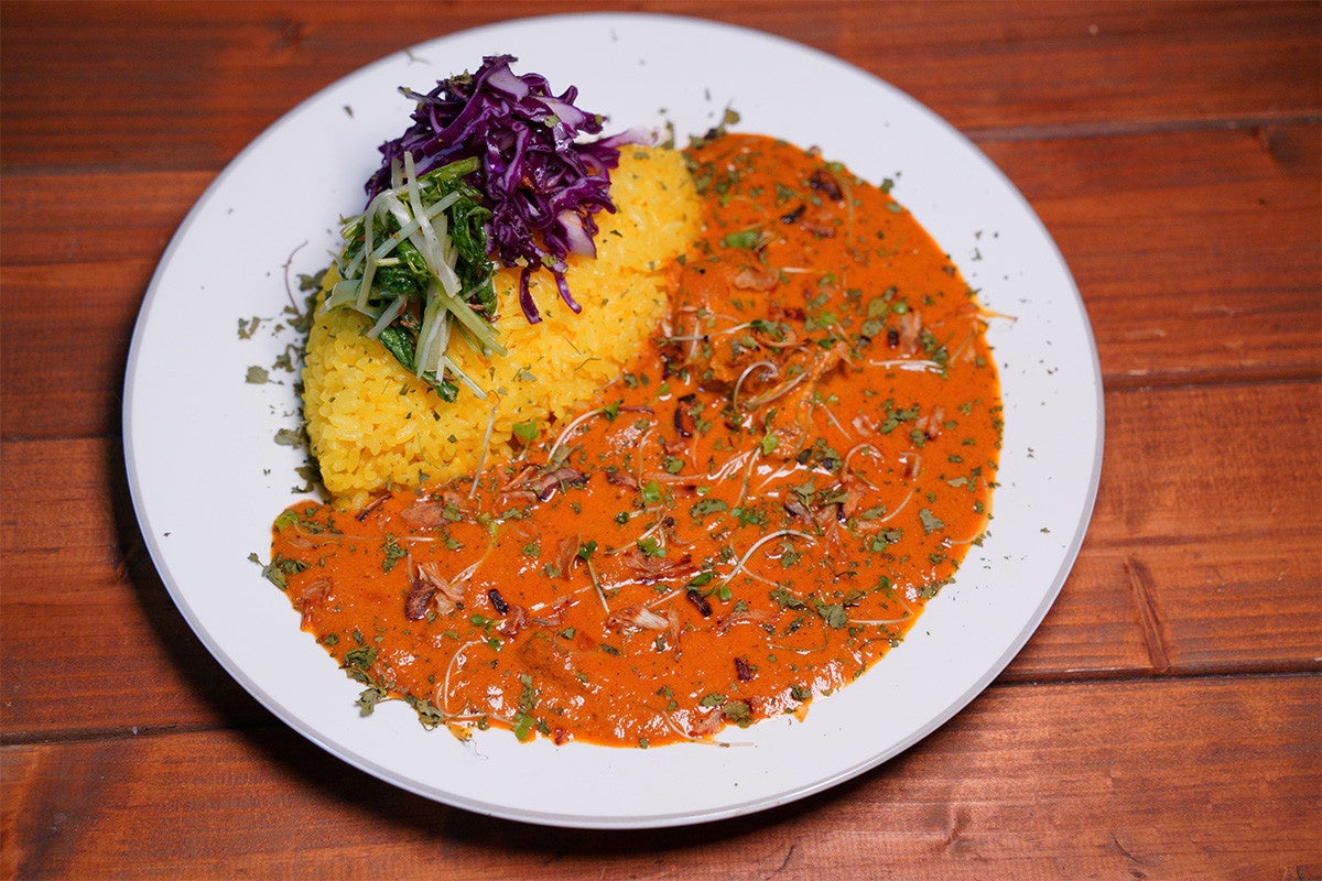 スパイスソムリエの店主が緻密に計算し配合したスパイスを使用した自慢の無水カレーに、国産の上質な胸肉を丁寧に炊きあげ秘伝のガラムマサラと塩で味付けをした特製マサラチキン。そして、栄養価満点のスプラウト野菜を添えております。