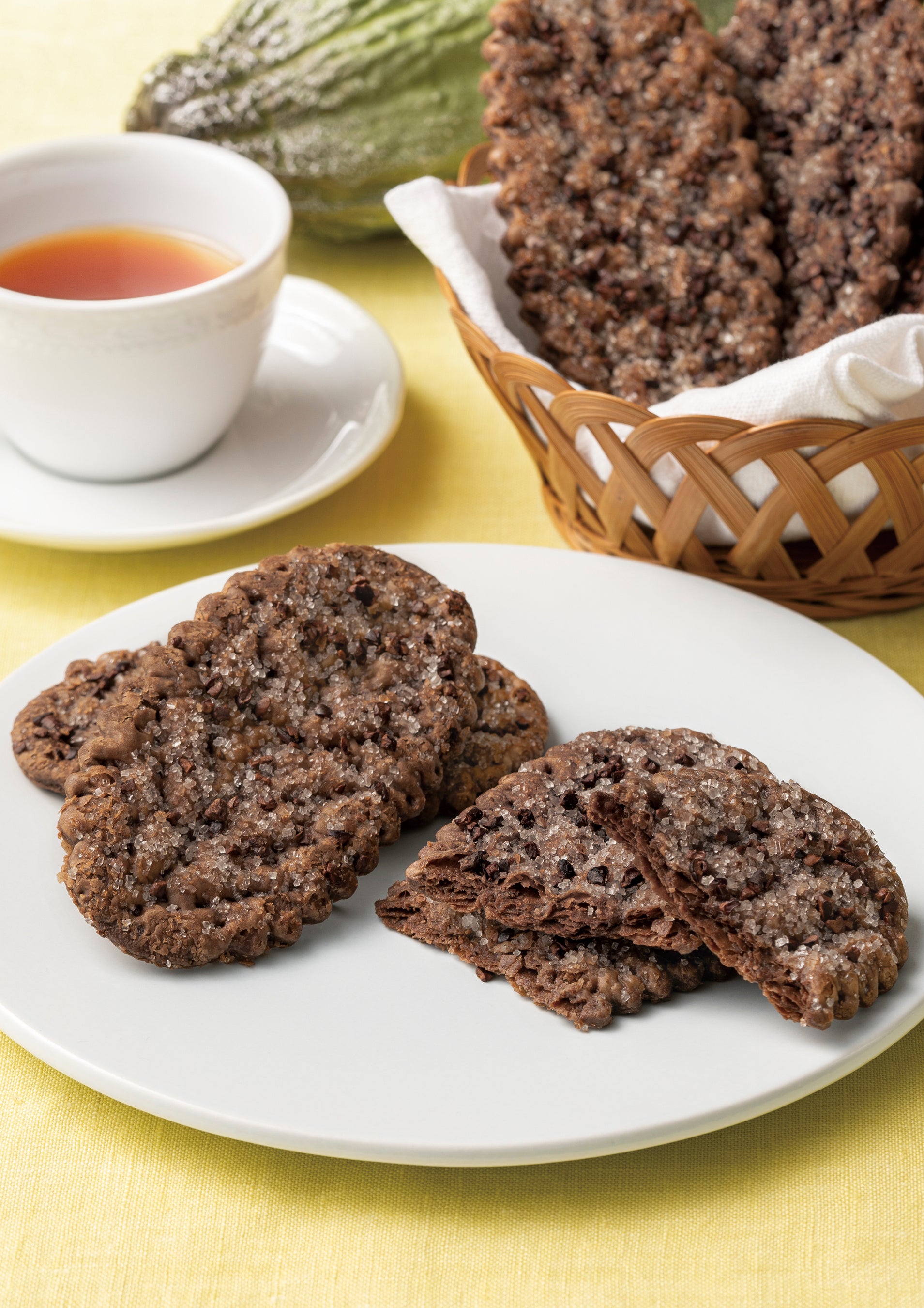 程よい甘さとビター感に加え、繊細な食感とカカオの香りが楽しめる、「リーフパイ カカオ」は、リフレッシュタイムのお供やプチギフトにもおすすめです。また、トースターで30秒ほど温めて少し冷ましてから召し上がるとカカオの香りがより一層豊かに広がり、カカオニブの香ばしさの中にバターのコクも感じられ、焼きたてのような食感も楽しめます。