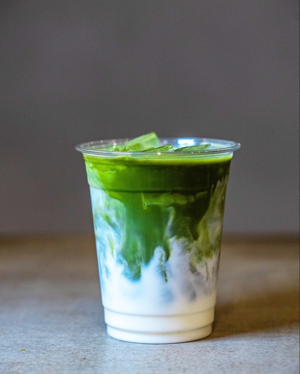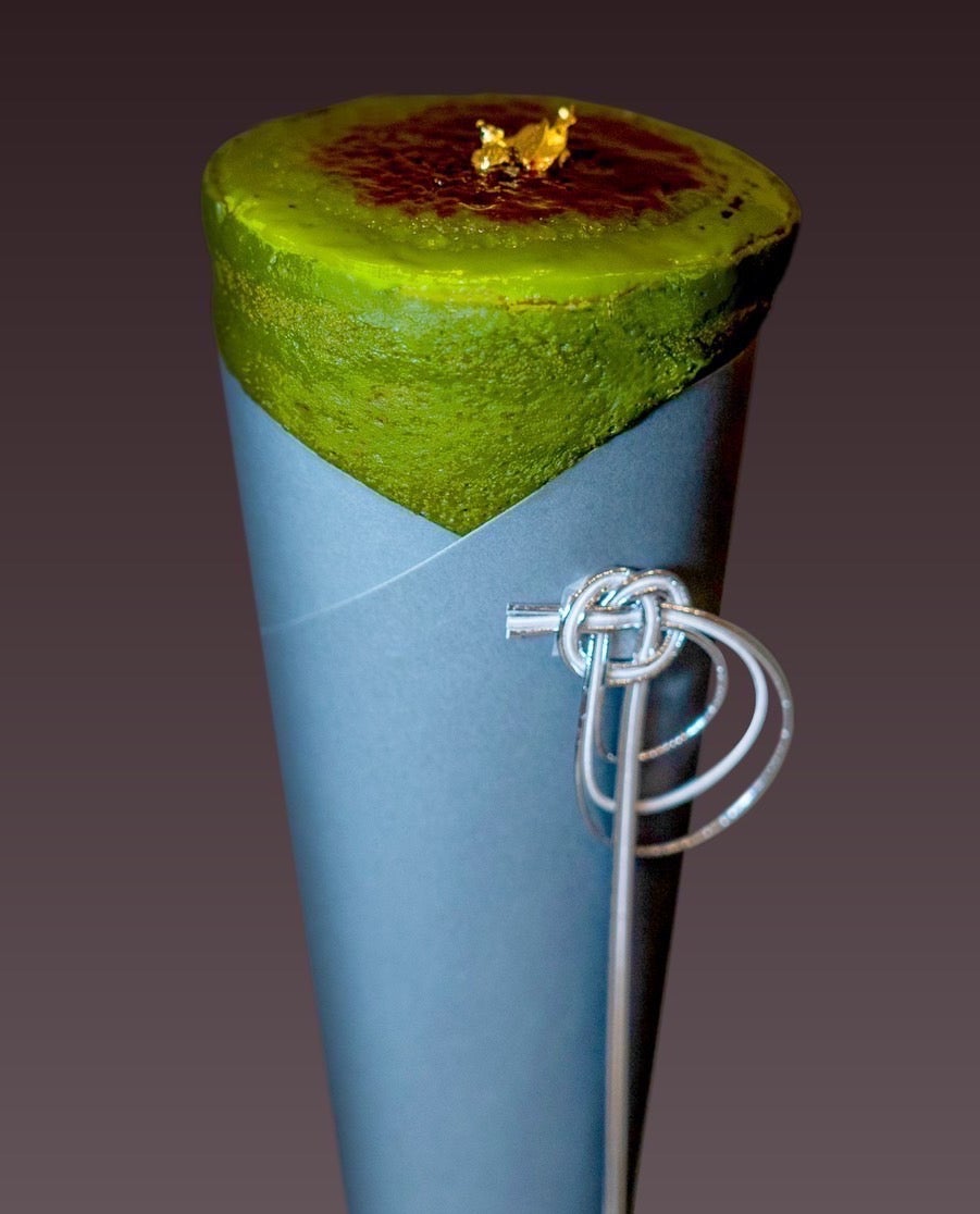 表面に抹茶パウダーをまぶし、中にはホイップクリーム、抹茶のカスタードクリーム、マスカルポーネクリーム、冷たい抹茶アイス、エスプレッソがしみ込んだクッキーを包んでおります。