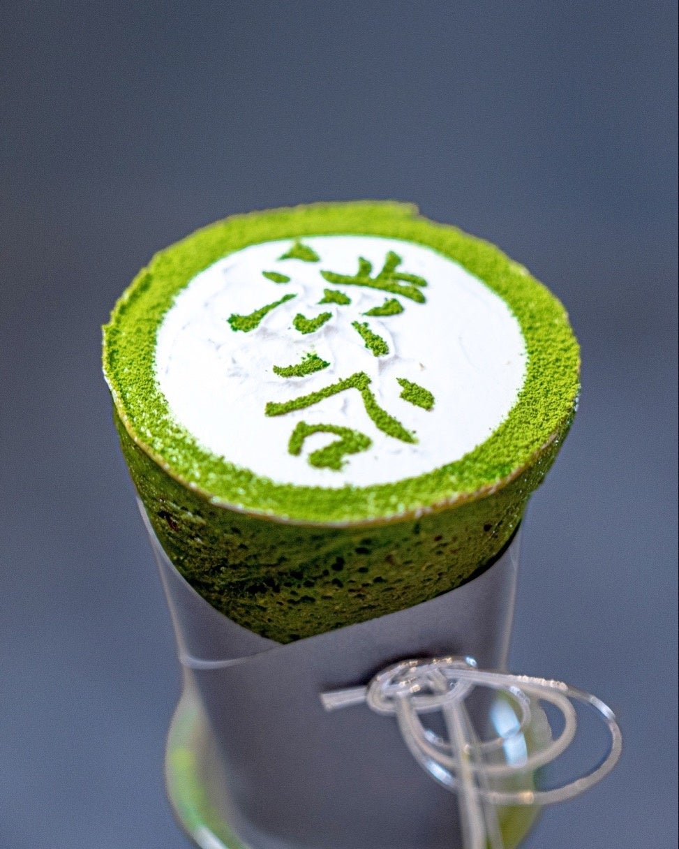 表面に抹茶パウダーをまぶし、中にはホイップクリーム、抹茶のカスタードクリーム、マスカルポーネクリーム、冷たい抹茶アイス、エスプレッソがしみ込んだクッキーを包んでおります。