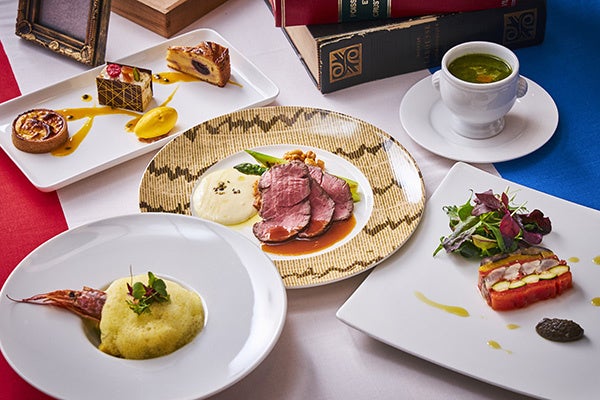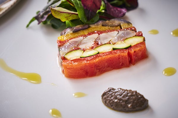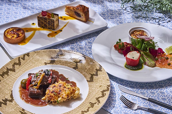 ランチ、ディナーとも南フランスのテイストを盛り込んだコース料理をご用意いたしました。ディナーコースでは、夏野菜とアジのプレッセをオリーブのペースト‶タプナード“と一緒にお召し上がりください。「マルセイユ風ブイヤベース」は魚介の旨味が凝縮したスープを泡状にし、見た目も鮮やかな逸品です。ランチコースでは、オードブルにラングドック地方の郷土料理ブランダードやプロヴァンス地方を代表するラタトゥイユをお楽しみいただけます。また、弱火でコトコト煮込んだ柔らかな和牛のブレゼなど魅力溢れる料理の数々をお楽しみください。