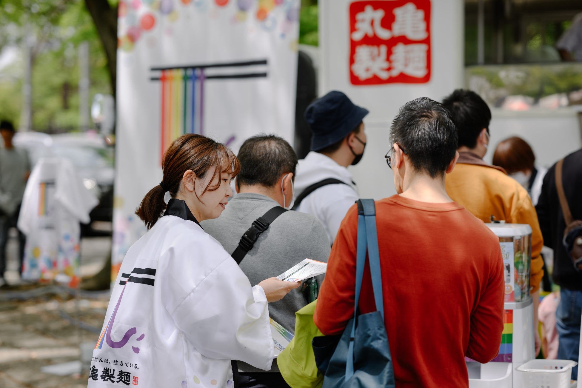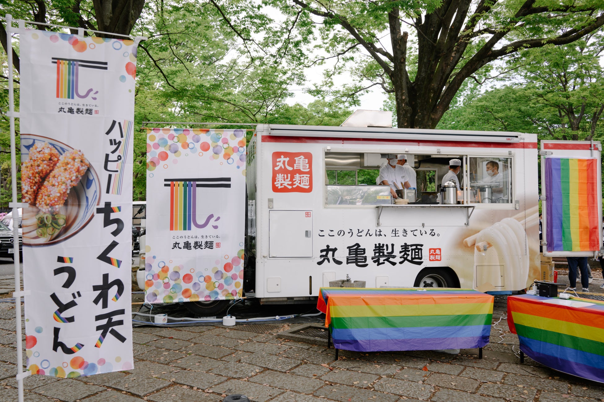 丸亀製麺キッチンカーを出展し、多様性の尊重をイメージしたTRP限定メニュー「ハッピーちくわ天うどん」をアライグッズ付で販売するほか、トリドールグループのLGBTQインクルージョンの取り組みを紹介しました。