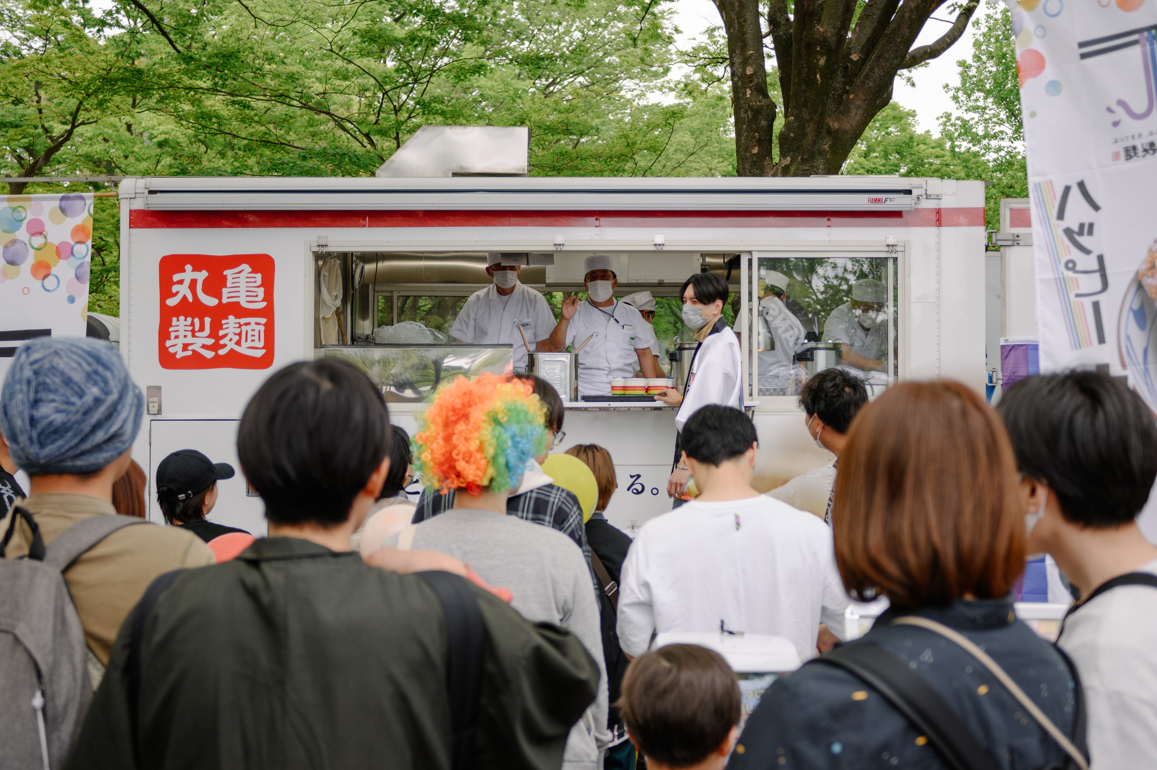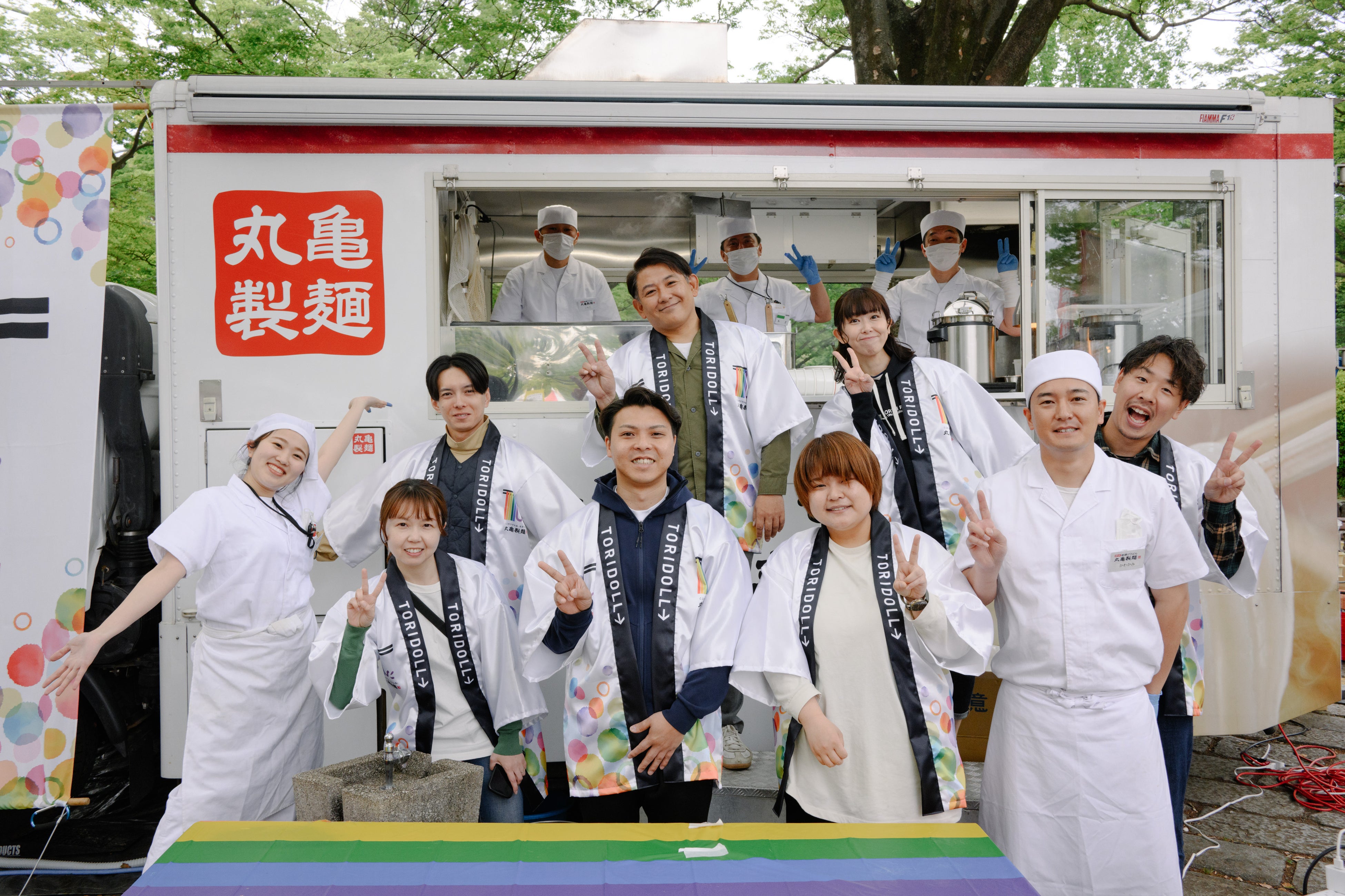 丸亀製麺キッチンカーを出展し、多様性の尊重をイメージしたTRP限定メニュー「ハッピーちくわ天うどん」をアライグッズ付で販売するほか、トリドールグループのLGBTQインクルージョンの取り組みを紹介しました。