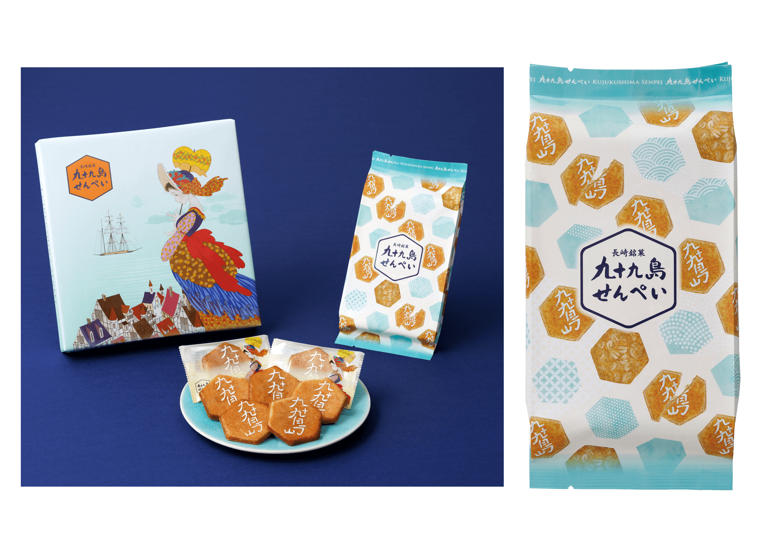 1951年に誕生した九十九島せんぺいは、縁起物である海亀の甲羅をかたどった六角形の生地にピーナッツをちりばめたパリッとした独特の食感と香ばしい味わいのお菓子です。六角形の生地は九十九島の海を、ピーナッツは九十九島の大小の島影を表しています。