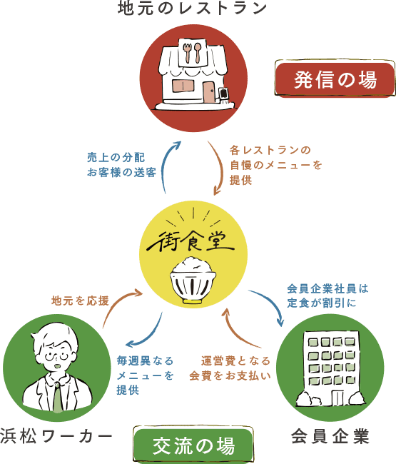 他方で海・山・川・湖と自然にも恵まれ、また浜松を本拠地とする優良企業も多く、「やらまいか精神」を合言葉に若手企業家や新しいチャレンジを応援する風土もあるのが浜松です。街食堂は会員企業の多様な世代の働き手を中心に、起業家や個人で活動する人々が交流を深める場となり、浜松で働く価値を上げること、また次世代が育つ場になることを目指し運営してまいります。