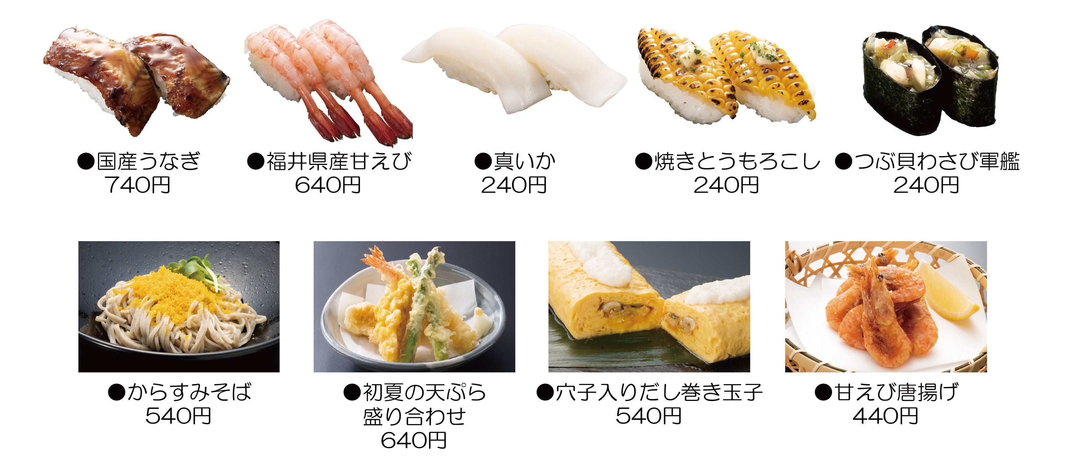 独特の歯応えと旨みが舌に絡みつくアジ類の“王様”『しまあじ』をはじめ、初夏の美味が目白押し。『かんぱち』は鮮度よくコリコリした歯応えと濃厚な旨みと甘みが特徴、『ほたて霜降り』は絶妙な食感と口の中に広がる甘みが楽しめ、ポン酢と相性抜群です。お寿司とご一緒に楽しんでいただきたいサイドメニューも充実しています。北海道産石臼挽きそばを使用した贅沢な『からすみそば』や頭からまるごと食べられる福井県産『甘えび唐揚げ』など全4品が新登場です。