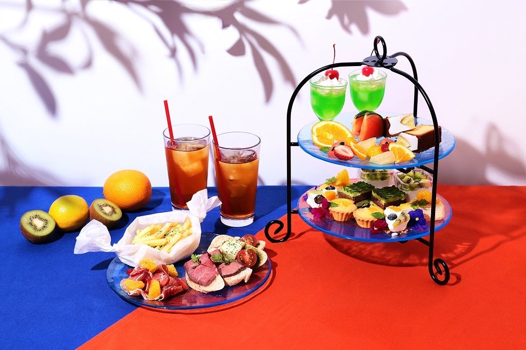 フレッシュなフルーツをたっぷり使った種々のスイーツに、見た目も涼やかな「クリームソーダゼリー」や、ひんやり&さっぱりデザートとして人気の「ヨーグルトバーク」など、初夏にふさわしい爽やかな顔ぶれがティースタンドに並びます。