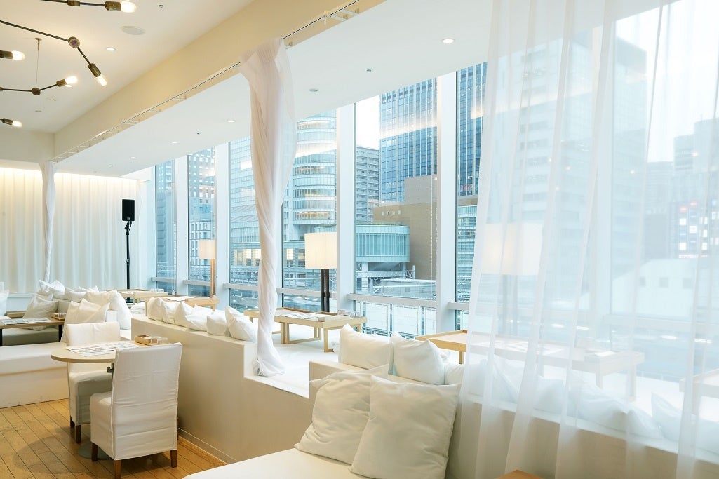 メインフロアは、一面のガラス窓から人々が行き交う秋葉原の街の賑わいを望むことができる小上がり座敷と、座り心地の良いソファと椅子で設えられたテーブル席が、白で統一された空間の中に遊び心を漂わせ、奥に進むと、個室の小上がり席と、柔らかなカーテンで仕切られたテーブル席が、隠れ家のような雰囲気を醸し出します。