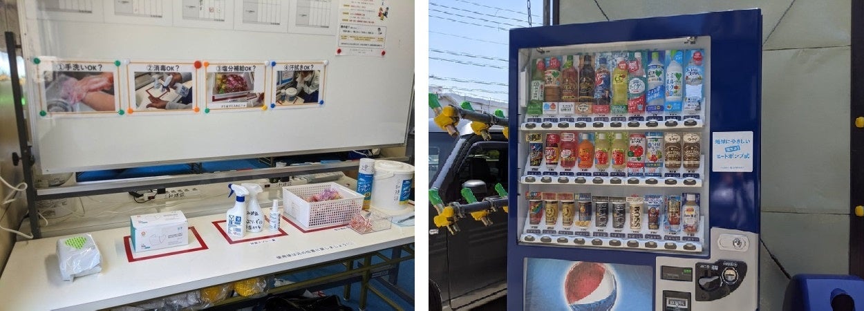 休憩所の入り口にはマスクや消毒液、コールドスプレーや塩飴や干し梅などが注意喚起とともに完備。自動販売機では「すっきりしたトマト」「グリーンダカラ」と塩分補給ができる「塩ライチ&ヨーグルト」を70円と50円で販売しており、差額は三和建設と協力会で補助しています。