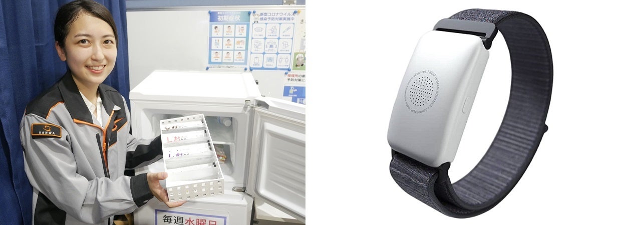 朝礼及び昼礼終了時にしおゼリーの配布。暑熱下のリスクを検知して、熱中症になる前にアラームとLEDでお知らするウェアラブルデバイス「カナリア」を三和建設の管理する全現場の職人さんに配布。せ。シンプルな腕時計型のデバイスを腕に装着するだけで、深部体温の上昇を検知します。