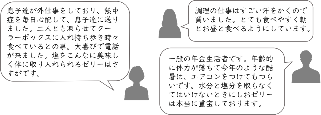・ここ数年夏は熱中症で倒れ救急外来を受診していました。昨年貴社のゼリーを知り購入し主人に仕事に行くときに持たせました。1日2〜1袋会社で食べていましたおかげで昨年は救急外来を受診しないで済みました。
