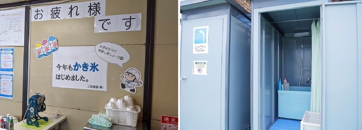 ミスト扇風機は現場内にも設置しています。冷房完備の仮設トイレ完備の作業所もあります。