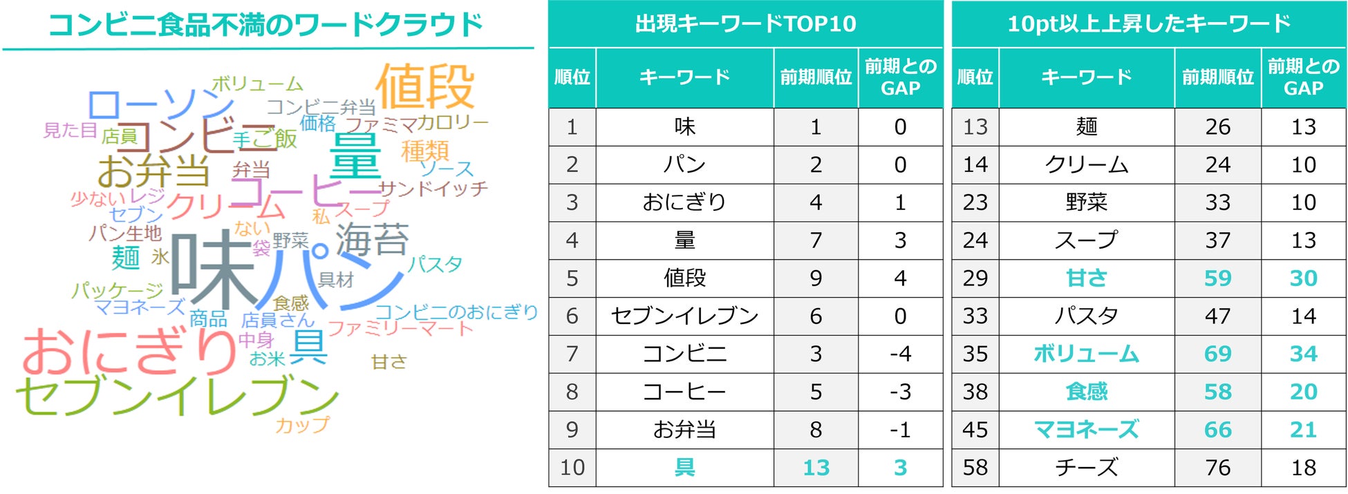 出現キーワードランキングで新たにTop10入りしたものは「具」。 10pt以上順位を上げたキーワードの中でも特に顕著なものは、「甘さ」「ボリューム」「食感」「マヨネーズ」となった。