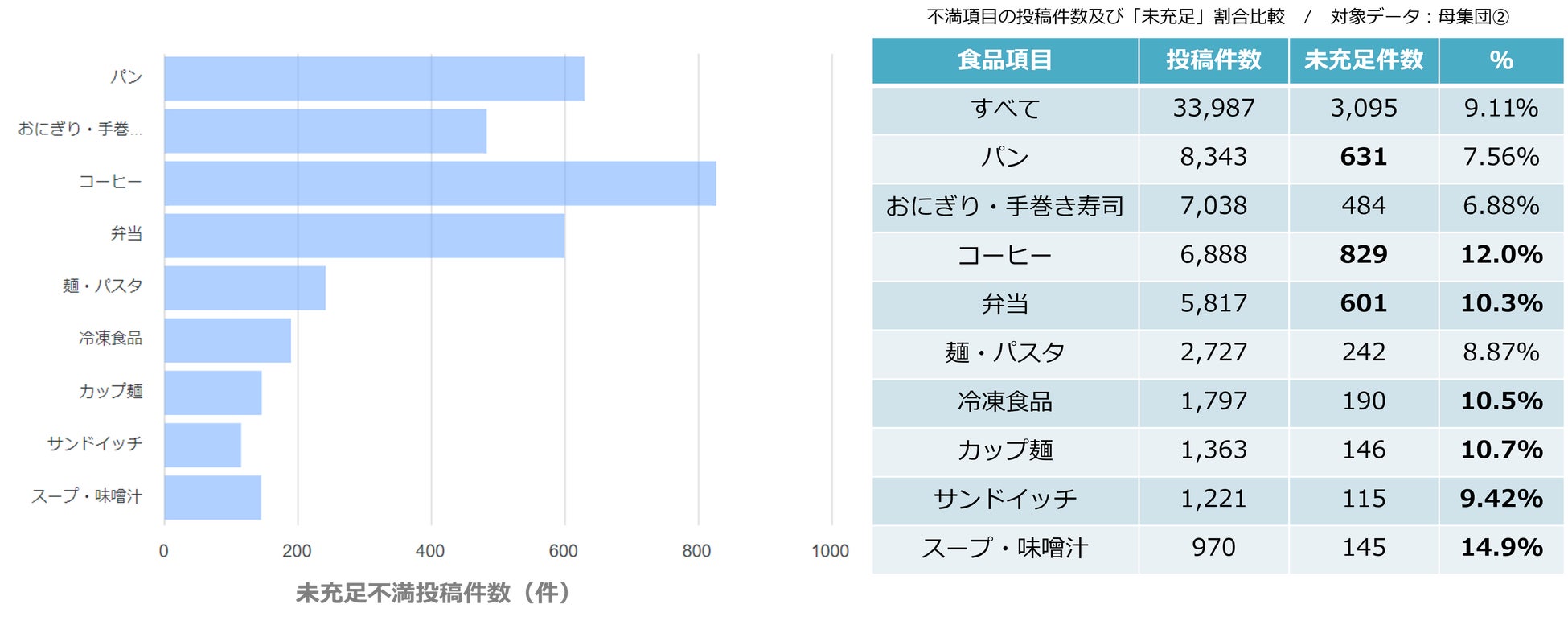 母集団②を対象に、食品項目別の「未充足」の投稿件数と割合を比較した。未充足不満の投稿件数は「パン」「コーヒー」「弁当」が上位となった。 未充足不満の割合は「コーヒー」「弁当」「冷凍食品」「カップ麵」「サンドイッチ」「スープ・味噌汁」が全体平均の9.11%を上回った。