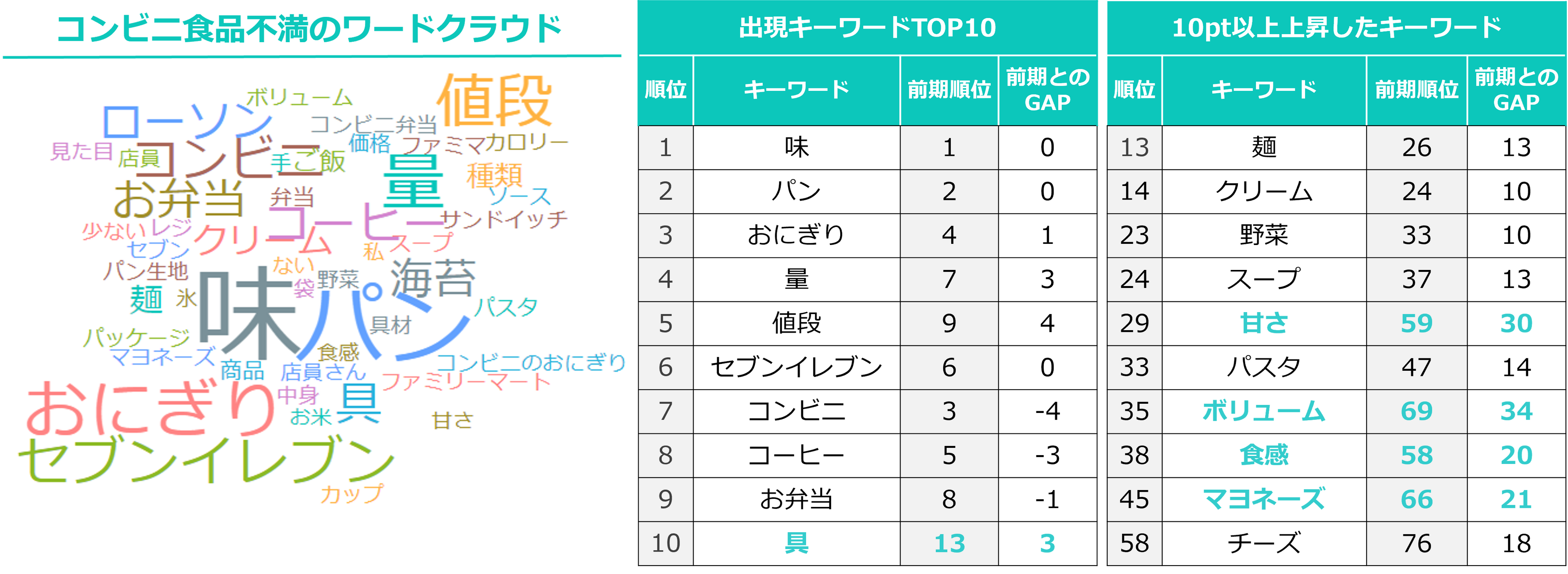 出現キーワードランキングで新たにTop10入りしたものは「具」。 10pt以上順位を上げたキーワードの中でも特に顕著なものは、「甘さ」「ボリューム」「食感」「マヨネーズ」となった。