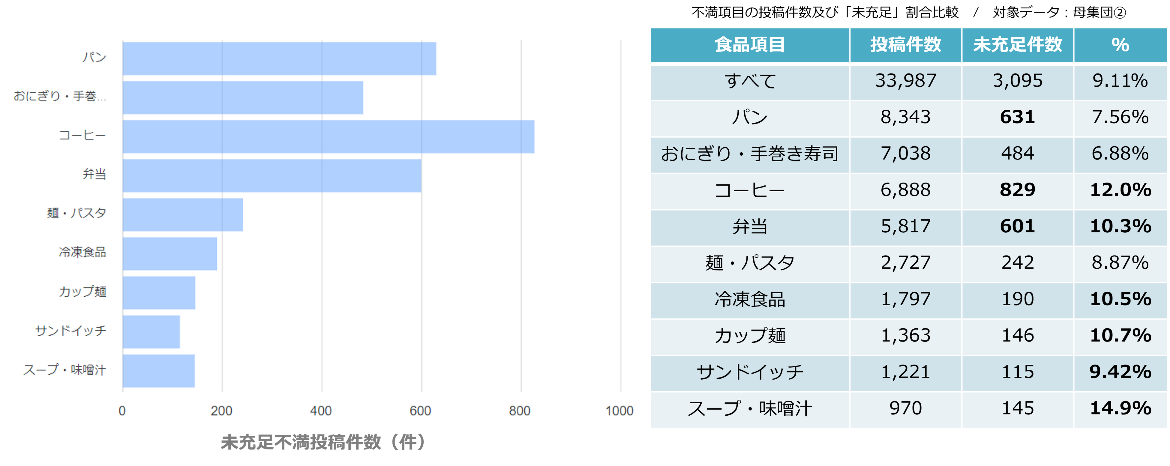 母集団②を対象に、食品項目別の「未充足」の投稿件数と割合を比較した。未充足不満の投稿件数は「パン」「コーヒー」「弁当」が上位となった。 未充足不満の割合は「コーヒー」「弁当」「冷凍食品」「カップ麵」「サンドイッチ」「スープ・味噌汁」が全体平均の9.11%を上回った。