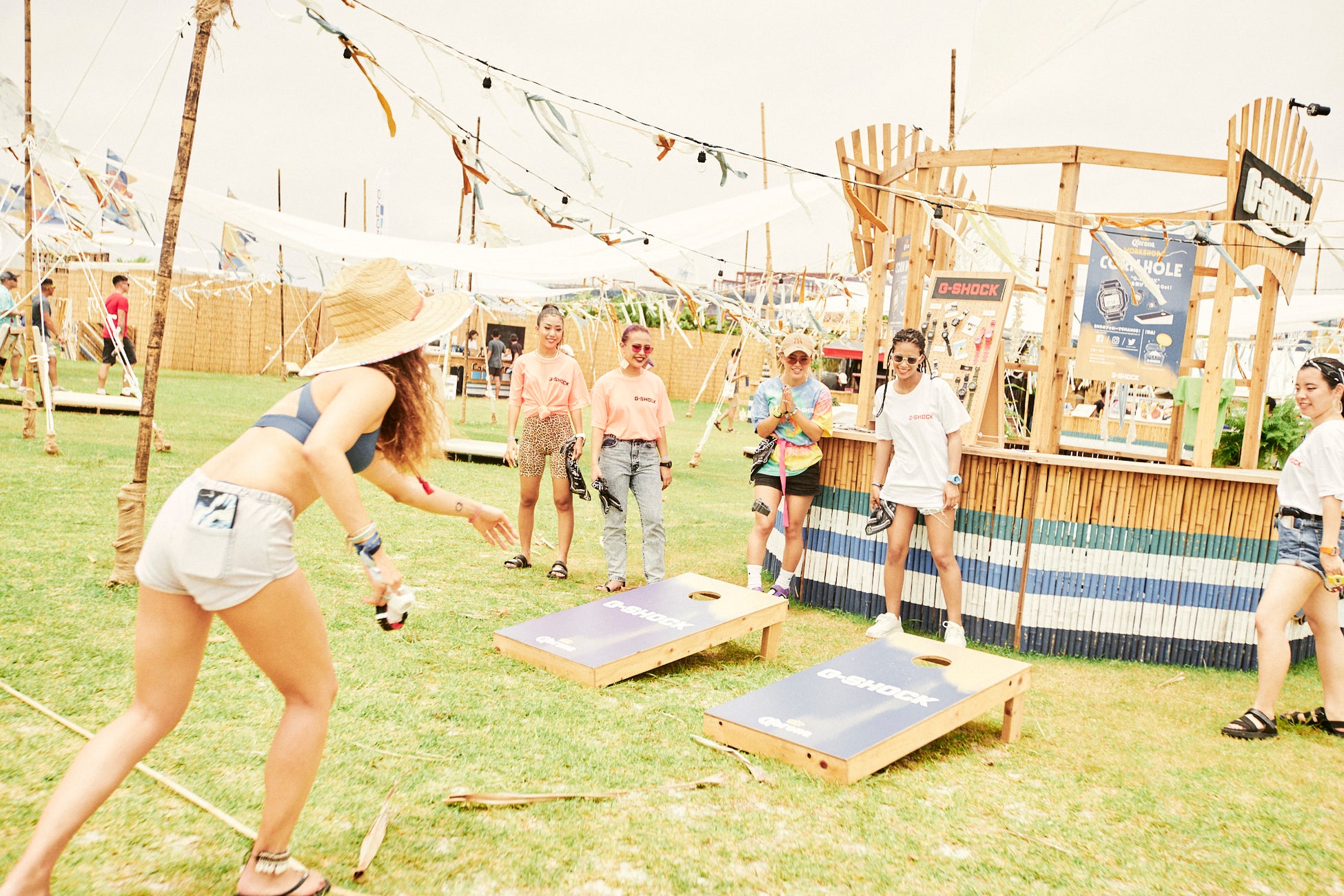 アメリカでポピュラーな芝生を使ったゲーム「コーンホール」がコロナ エキストラデザインで登場。布袋にトウモロコシの粒を詰めた”ビーンバッグ”を、ボードの穴に投げ入れ点数を獲得するゲームです。高得点の方にはドリンクチケットをプレゼントいたします。