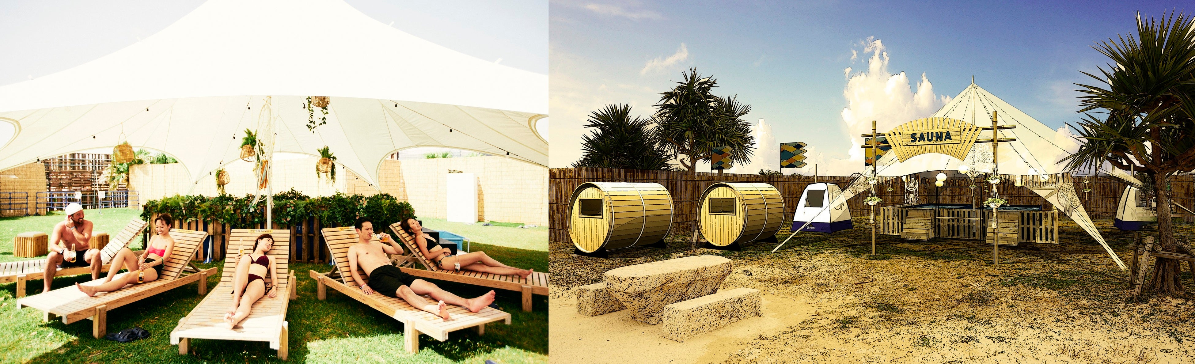 2019年に初めて登場し、大人気だったサウナブランド「TTNE」監修のフィンランド式サウナが今年も登場。南国用にアップデートされ、ビーチという特性を活かして設置します。