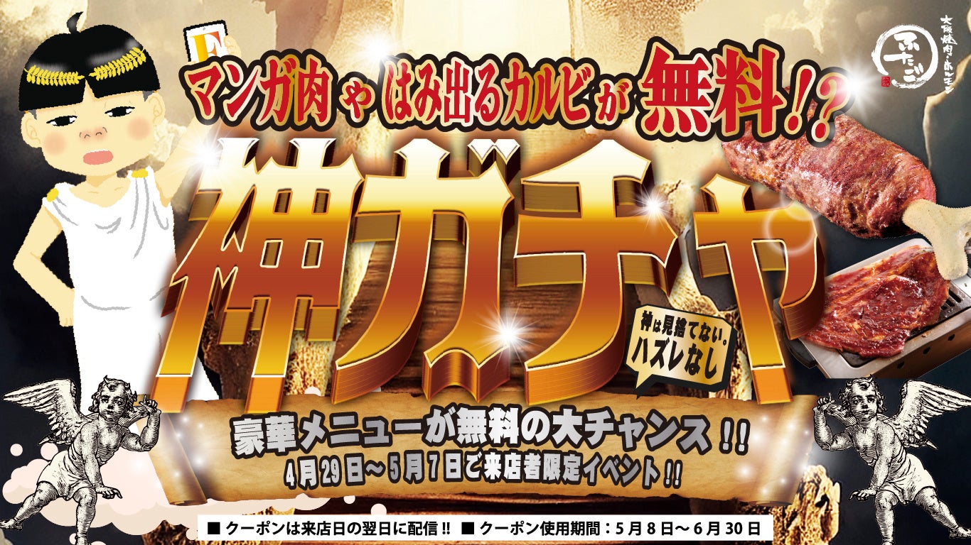 ご来店日ごとに“神ガチャ”がもらえるので、最大9回ガチャができて人気メニューが無料になる大チャンス!