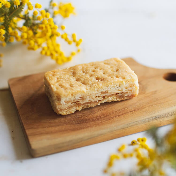 北海道産発酵バターときび糖で丁寧に折り上げた優しい甘さのパイです。丸みを持たせたことで厚みが生まれ、ざくっとした歯触りの仕上がりになっています。原材料がシンプルな分、素材の美味しさを感じていただきやすいおやつです。