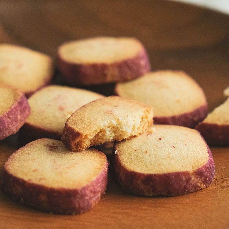 生地にはさつまいものペーストをたっぷり使用し、紫芋パウダーでさつまいもの皮の部分を表現した味も見た目もさつまいものクッキー。