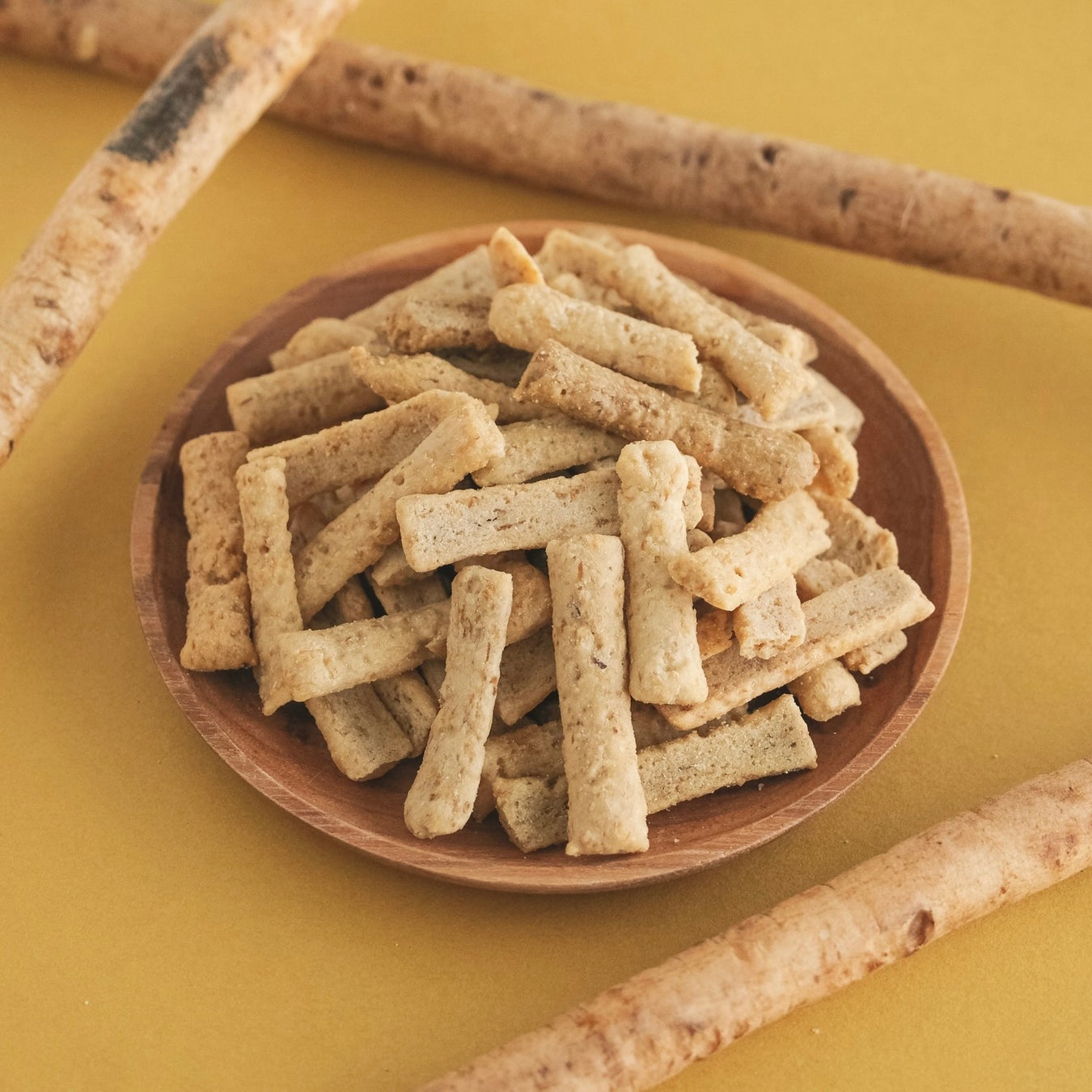 体への優しさを考えて、植物性の原料だけで作ったごぼうスティックです。ノンフライなのにカリッとした食感が楽しめるのも魅力の一つです。