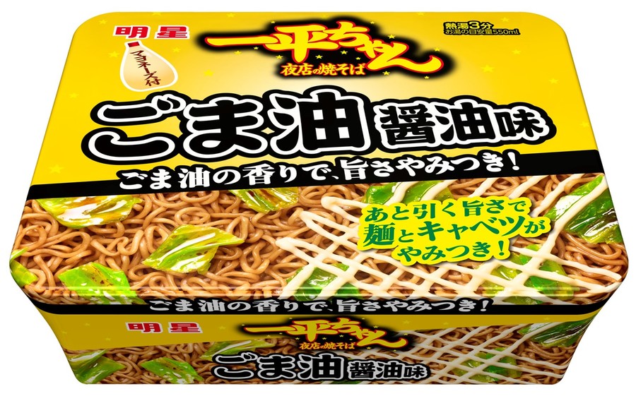 今回の新商品「明星 一平ちゃん夜店の焼そば ごま油醤油味」は、ごま油が香る醤油だれとマヨネーズで食欲そそる風味に、ごま油と相性の良い約2倍量※のキャベツと麺で楽しめる一品に仕上げました。やみつきになる一平ちゃんをぜひお楽しみください。