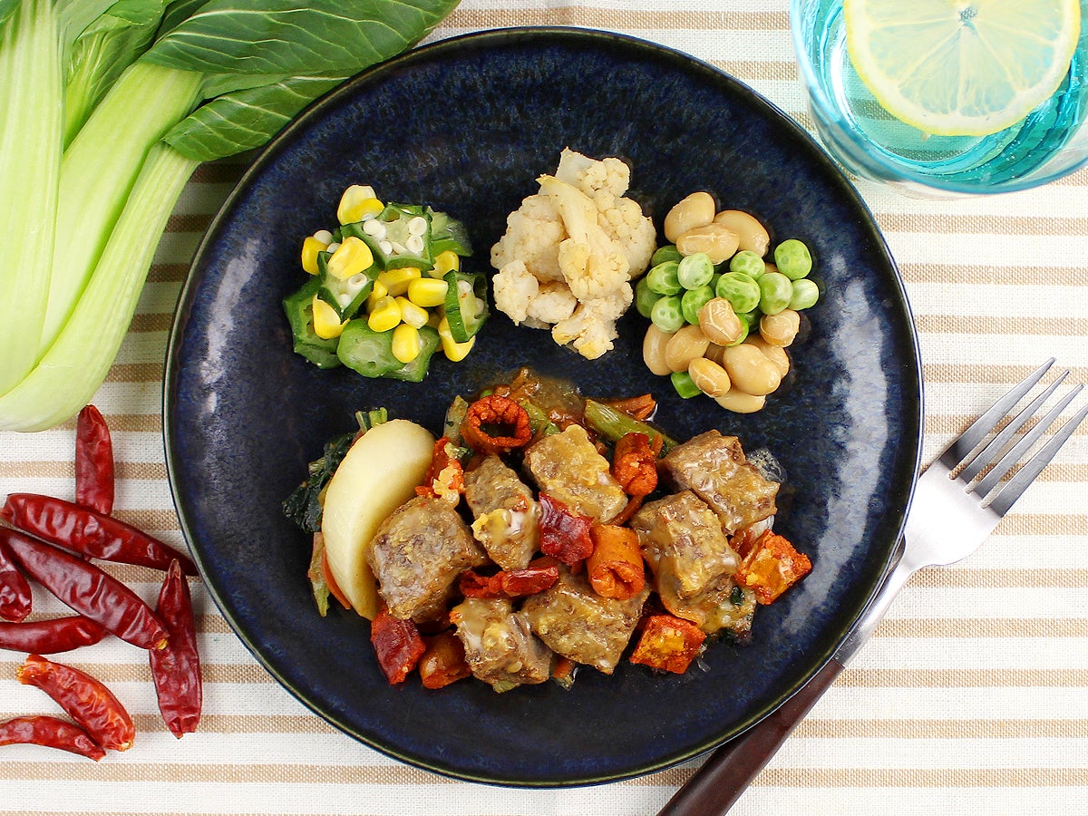 牛ひき肉のサイコロステーキ(成型肉)の上にフライした唐辛子をちらし、麻辣醤とごまをベースにトウチを隠し味にしたソースをかけました。添え野菜には、マコモダケ、青梗菜、人参を使用しております。よく混ぜてお召し上がりください。