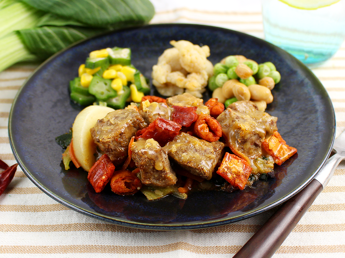 牛ひき肉のサイコロステーキ(成型肉)の上にフライした唐辛子をちらし、麻辣醤とごまをベースにトウチを隠し味にしたソースをかけました。添え野菜には、マコモダケ、青梗菜、人参を使用しております。よく混ぜてお召し上がりください。