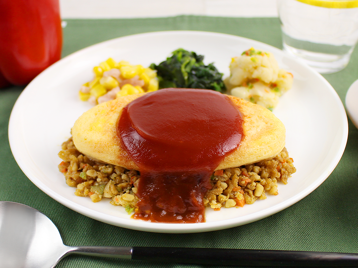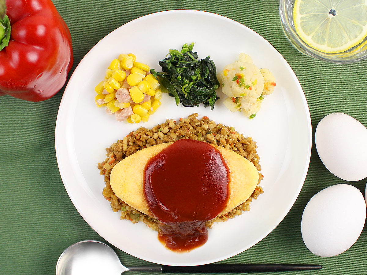 創作オムライス専門店「ポムの樹」監修プレートです。ポムの樹オリジナルのケチャップを使用し、ベーシックなオムライスに仕上げております。糖質を抑えるために、大豆を原料にしたそぼろとフレークの2種類を挽肉に見立てました。
