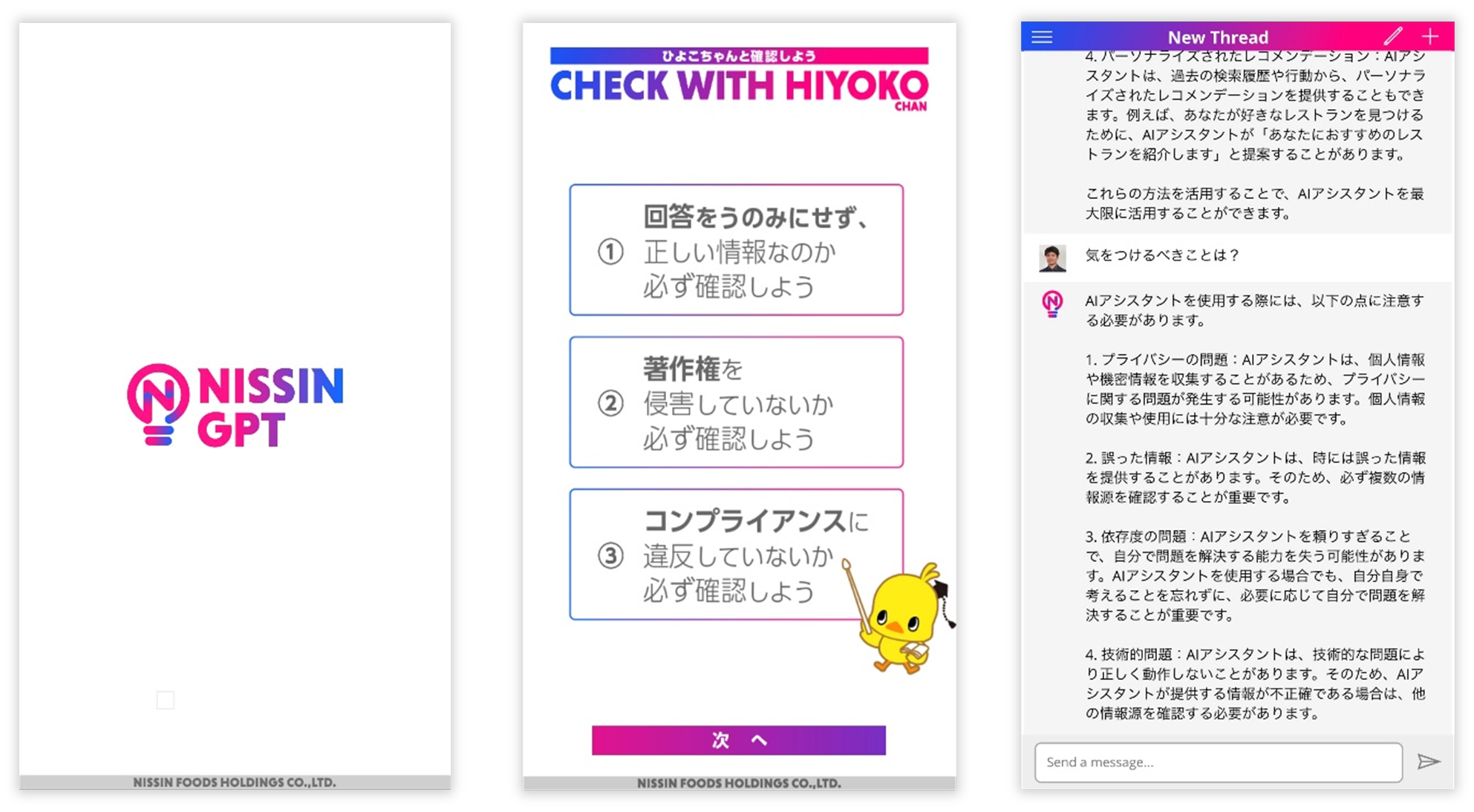 また、対話型AIから得られた情報にはプライバシー、コンプライアンス、フェイクなどの問題が潜んでいることから、情報の二次利用に関するリスクを「チキンラーメン」のキャラクター「ひよこちゃん」を活用して注意喚起することで、グループ社員のリテラシー向上を図っています。