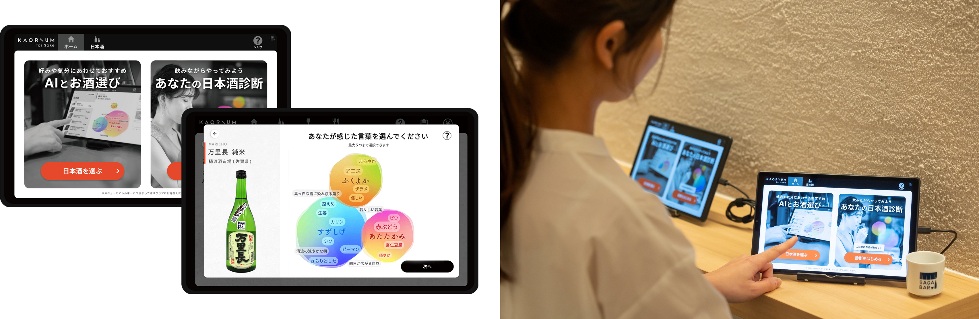 また、今回、新しい試みとして、お客様の好みや気分に応じてAI(人工知能)がおすすめの日本酒を提案してくれるサービス「KAORIUM(カオリウム)for Sake」を店内に導入します。同サービスは、1万以上の日本酒の風味・感性データと酒ソムリエの感性を学習した最先端のAIシステムであり、お酒の風味を言葉にすることで、最適な「人とお酒のマッチング」を導き出してくれるので、一人一人にあったピッタリのお酒がきっと見つかるはずです。