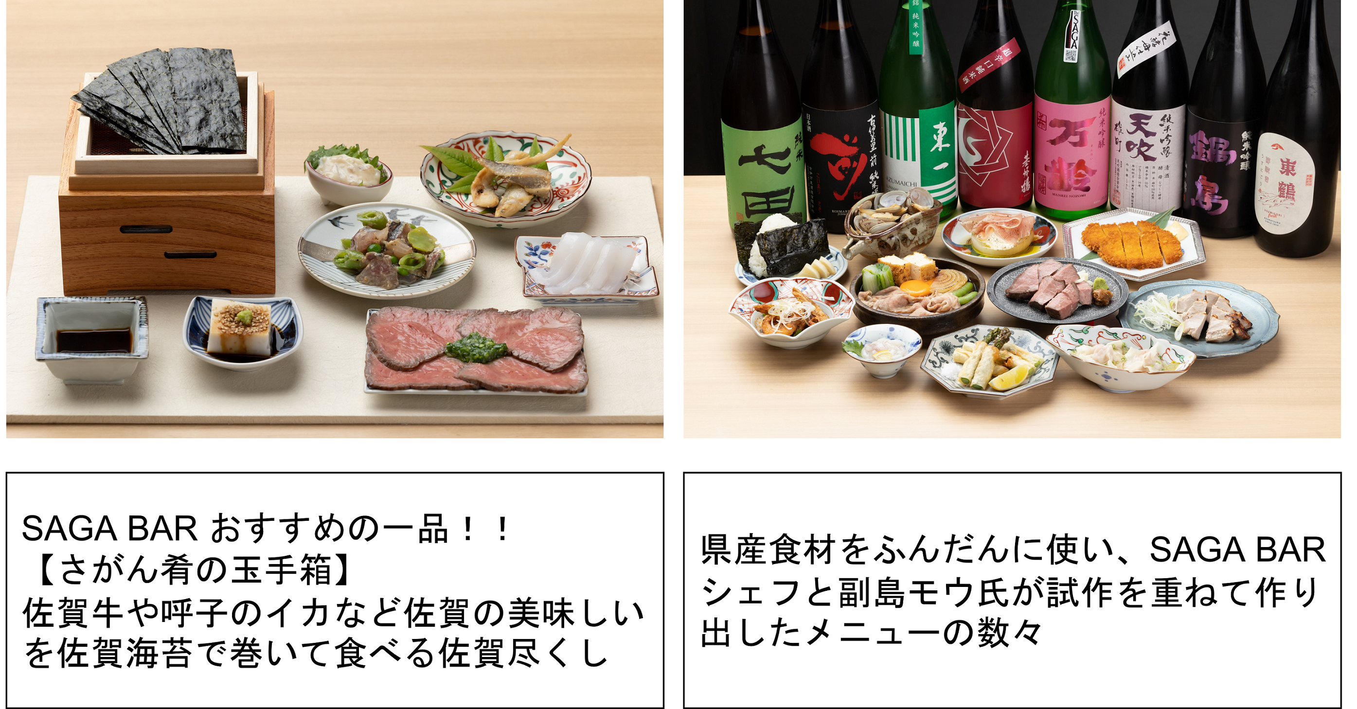 特に、メニューは、レシピ開発や企業コンサルティング、料理教室など幅広く活躍されている佐賀県出身のフードディレクター副島モウ氏が監修を務め、SAGA BARのために、佐賀牛や佐賀海苔など佐賀のイチ押し食材が詰まった「佐賀を味わえる一品」を考案していただきました。