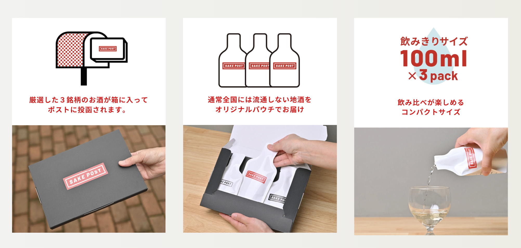 小容量の飲みきりサイズ100mlのオリジナルパウチに地酒と呼ばれる地域で愛され全国流通の少ないお酒が入り飲み比べできるよう3銘柄(プランによっては6銘柄)の日本酒が毎月ポストに届きます。