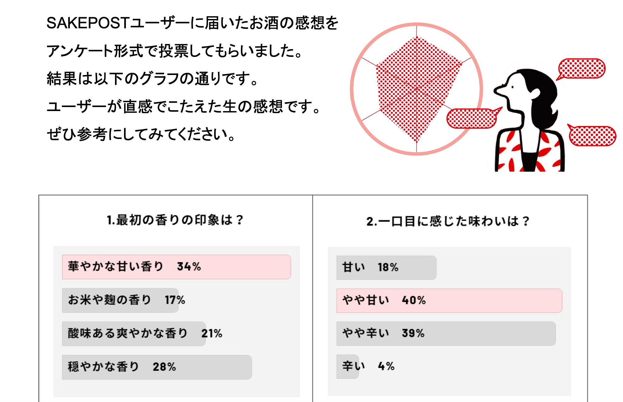 毎回ユーザーに4−5問の質問に回答していただき、お酒の味や香りの感じ方、相性の良い料理、温度帯など、さまざまな回答を集計して、ユーザーがもつこの銘柄のイメージをグラフ化したものを酒蔵にお届けします。