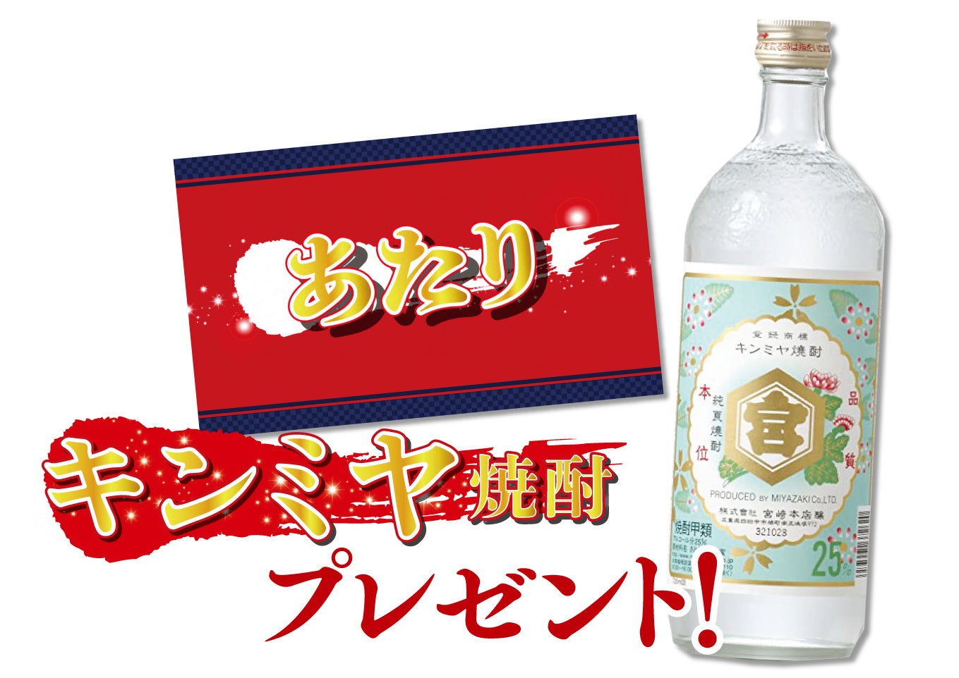 “あたり”が出た方には『キンミヤ焼酎ボトル(四合瓶)』をプレゼント!クセのないすっきりとした味わいが特徴の「キンミヤ焼酎」は、すっきりとした味わいの中にも、ほのかな甘みとまろやかな舌触りを演出します。ブレンドされる素材の美味しさをぐっと引き立てるため、どんな飲み方でもご満足いただける美味しさです。おすすめしているのが、ソーダ割で作る「キンミヤハイボール」。雑味が少なく後味がすっきりしているので、特に美味しく味わうことができ、焼き鳥との相性も抜群!