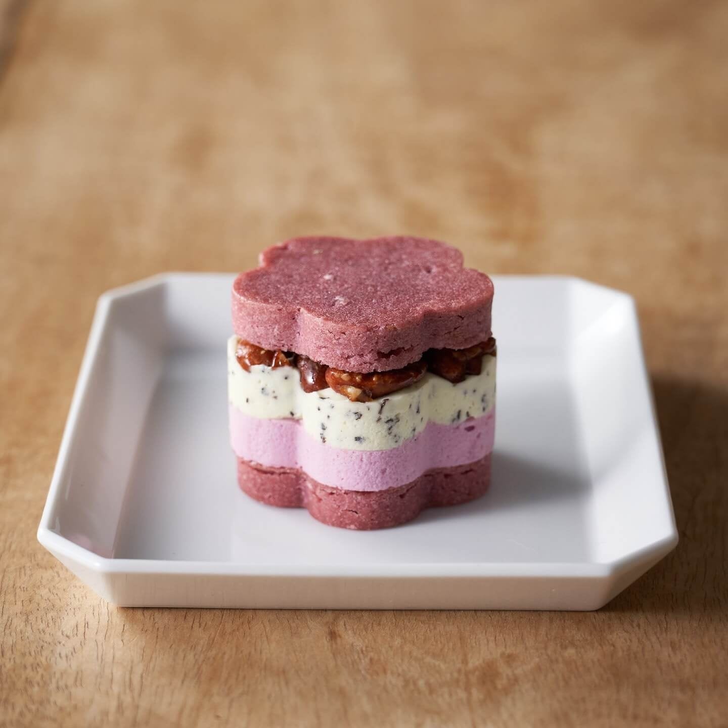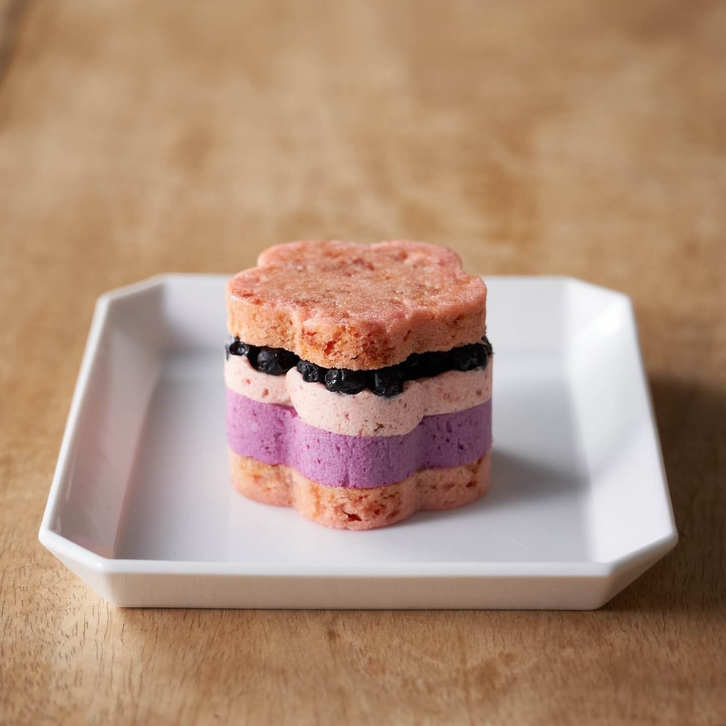 ストロベリーとブルーベリーを練りこんだ2層仕立てのバタークリームに、キャラメリゼしたヘーゼルナッツを忍ばせセミドライのワイルドブルーベリーをトッピング。ストロベリー顆粒を練りこんだサブレでサンドしました。